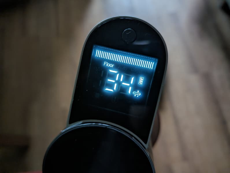 Действительно, в авторежиме прибор самостоятельно выбирает уровень мощности в зависимости от степени загрязнения поверхности, это бережет заряд аккумулятора. Мощность всасывания составила 92,9 аВт при максимальной потребляемой мощности и 19,4 аВт при минимальной. Заметим, что разница с заявленной мощностью всасывания не критична: наши тесты не раз показывали куда большие расхождения (в несколько раз). Показатели уровня шума варьировали от 75 до 84 дБА в разных режимах и конфигурациях, это не слишком тихо. В режиме влажной уборки на уровне «Floor» (пол) пылесос работал 41 минуту, а в режиме сухой уборки на минимальной мощности — целых полтора часа.