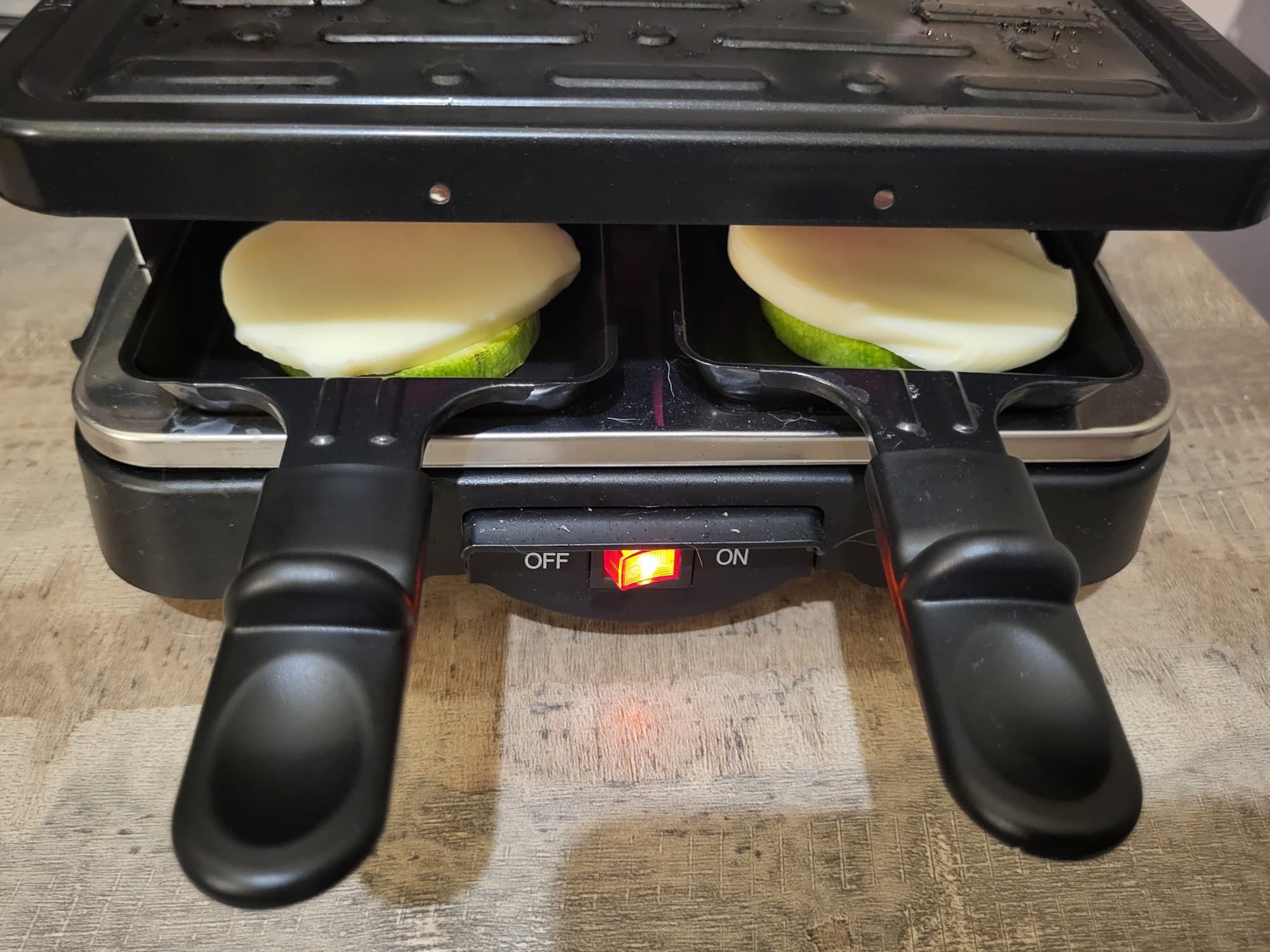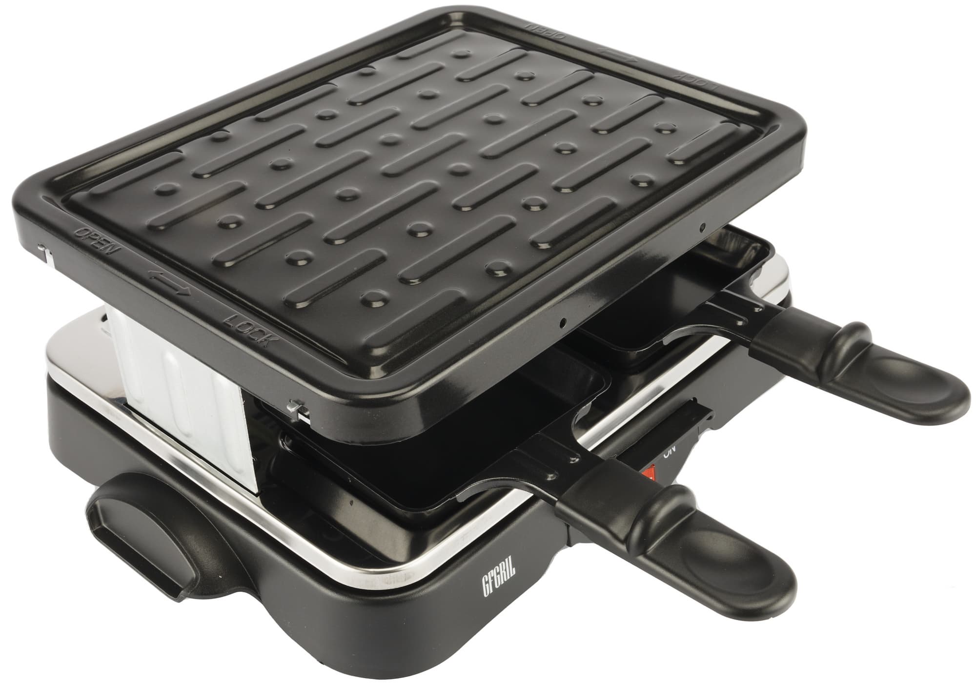 Сверху расположены пластины гриля (можно поджарить на них овощи или тостовый хлеб), внизу устанавливаются мини-сковородочки для, собственно, раклета. Вообще подобные приборы задумывались как дополнительное развлечение для компании, когда каждый делает себе раклет по своему вкусу на отдельной сковородочке. Так что вполне праздничная вещь.
