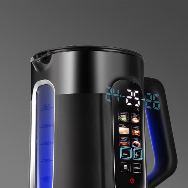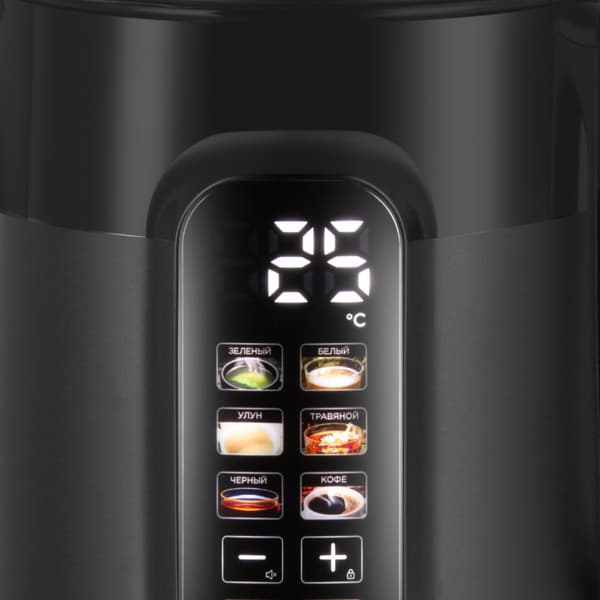 Это не очередной умный чайник от Редмонд с управлением через приложение. Изготовитель предложил перенести красочный и понятный интерфейс, который мы обычно видим на экране смартфона, прямо на чайник, и получилось неплохо. Не надо запоминать, какую температуру выбирать для того или иного напитка, можно просто выбрать его вид: черный чай, кофе, травяной чай, улун и т. д. Впрочем, выставить температуру с точностью до градуса тоже можно.