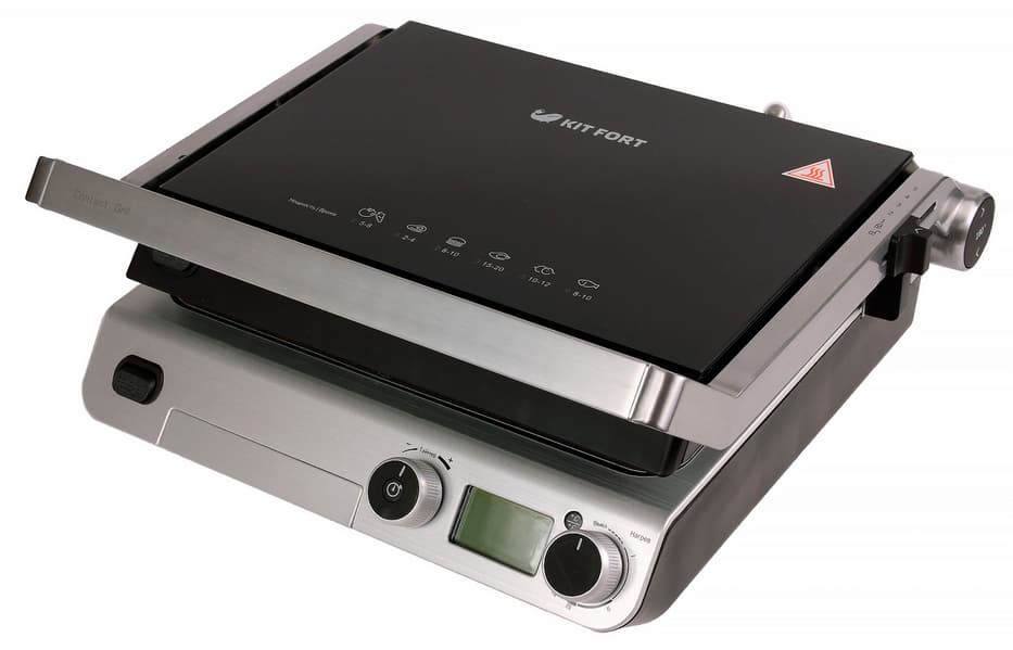 Еще один пример гриля из средней ценовой категории (и со средними возможностями) — очень похожий на предыдущую модель Kitfort KT-1640. Как мы видим, дизайн прибора и его технические характеристики оказался точно такими же, за исключением наличия электронного дисплея, на котором выставляется необходимая температура и устанавливаются настройки таймера автоматического отключения.