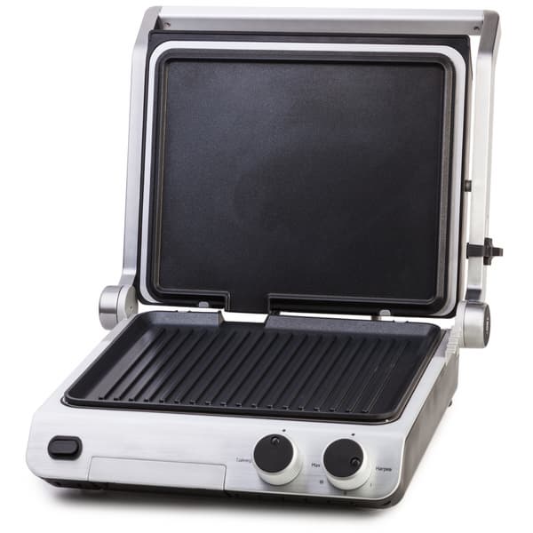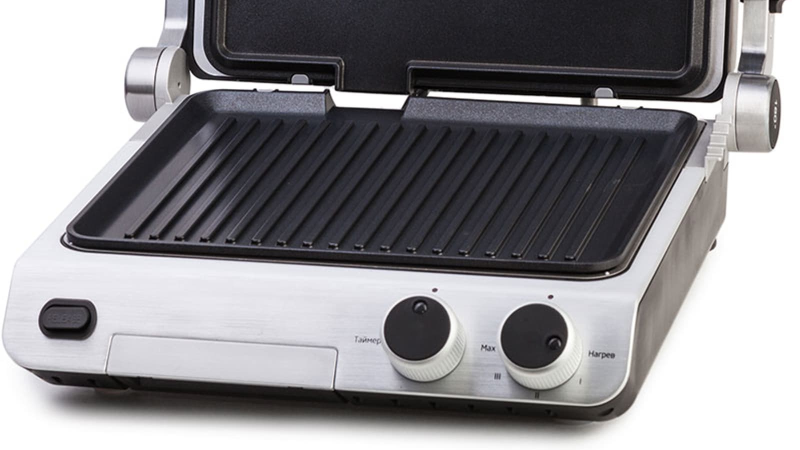 Из достоинств также отметим возможность раскрыть панели на 180 градусов, благодаря чему гриль можно превратить в две жарочные поверхности, одна из которых плоская, а это значит, что на гриле можно пожарить обычную яичницу-глазунью.