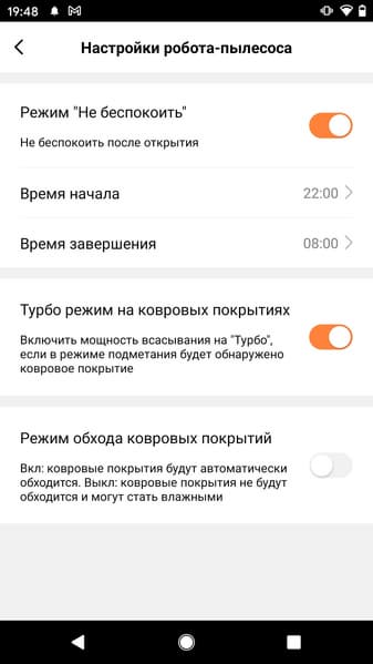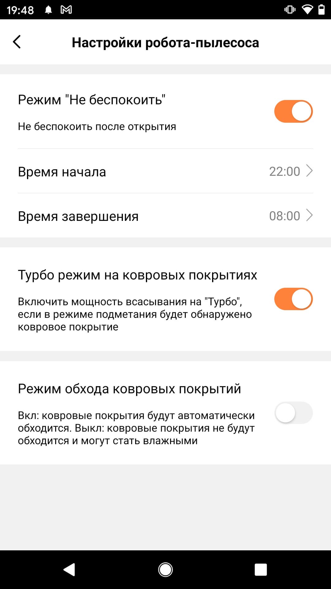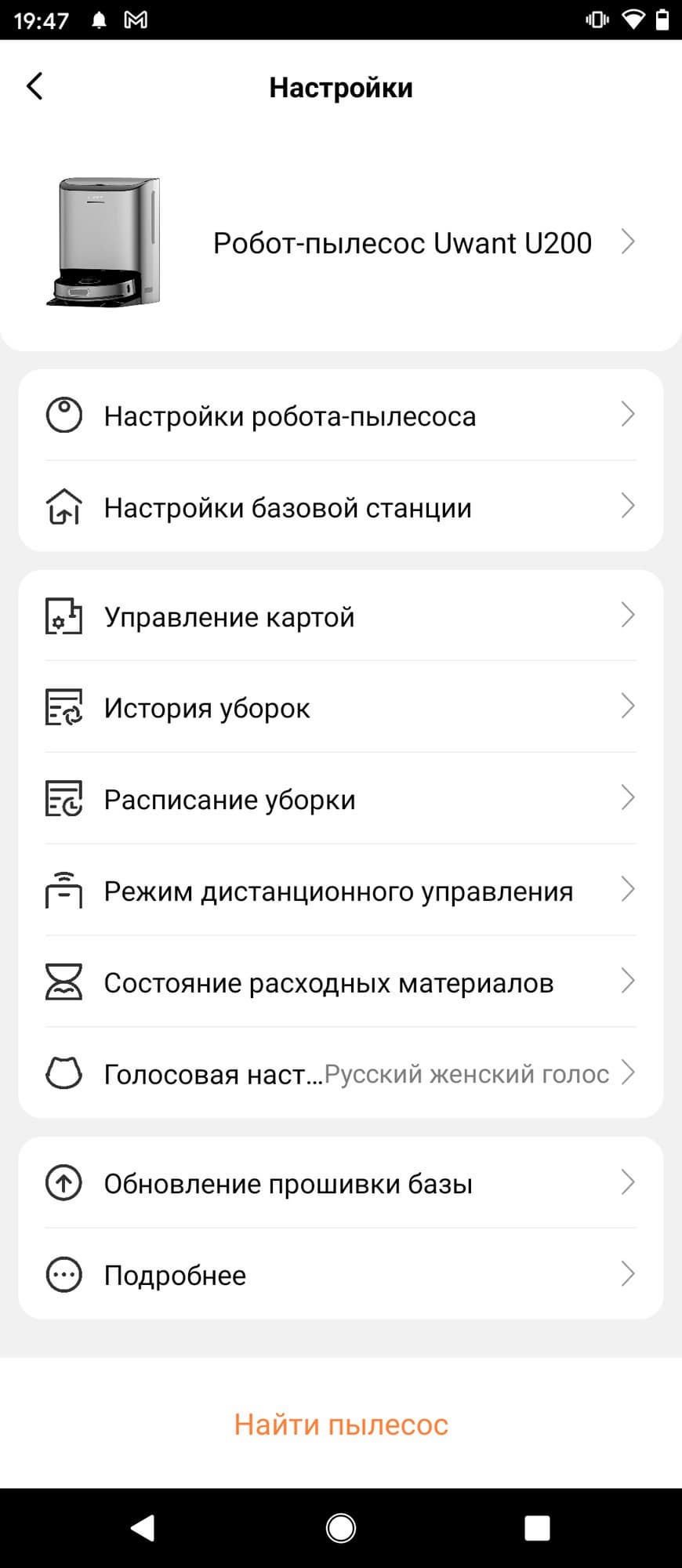 Пылесосом можно управлять кнопкой на корпусе, при помощи пульта ДУ и удаленно: он поддерживает экосистему Mijia и совместим с голосовыми помощниками — Ассистентом от Google и Alexa. Приложение предупреждает, что для лучшей навигации с редактированием карт помещения требуется выполнить хотя бы одну уборку в автоматическом режиме — после этого будет доступна карта помещения с расположением стен и мебели с точностью до миллиметров. Кстати, приложение поддерживает несколько карт помещения, что удобно для частного двух- или трехэтажного дома, многоуровневой квартиры или при выездах робота на дачу. Использование приложения позволяет выбрать режим уборки, задать ее расписание, выбрать уровень шума, создать «запретные зоны», узнать о ресурсе расходников — все достаточно стандартно, но ничего важного не упущено.