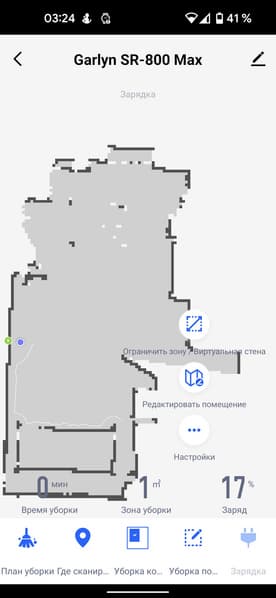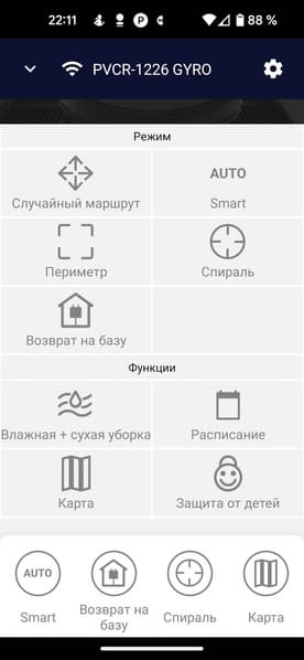 У робота есть несколько классических режимов работы — стандартный (авто), по спирали на ограниченном участке, вдоль стен, турбо — на увеличенной мощности, быстрая уборка за 30 минут. Как мы убедились, тестируя автоматический режим, модель двигается с низкой долей случайности, то есть не тратит зря заряд аккумулятора и убирает эффективно, двигается рационально, ловко избегая препятствий. Робот отлично находит базу, когда решает, что все чисто или когда до разрядки аккумулятора остается 20 процентов его ресурса. Сухой тестовый мусор он собирал в несколько проходов, и большая часть неубранного мусора — вокруг базы, что совершенно нормально. С учетом отсутствия у робота лидара, мы остались очень довольны качеством сухой уборки: оно сопоставимо с результатом роботов-пылесосов, оснащенных лазерными сенсорами. Мытье полов нас тоже вполне удовлетворило: ни потеков, ни разводов. Использование мобильного приложения для управления не составило сложностей — наоборот, понравилось: все просто, удобно, продумано.