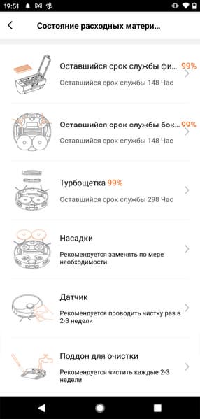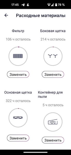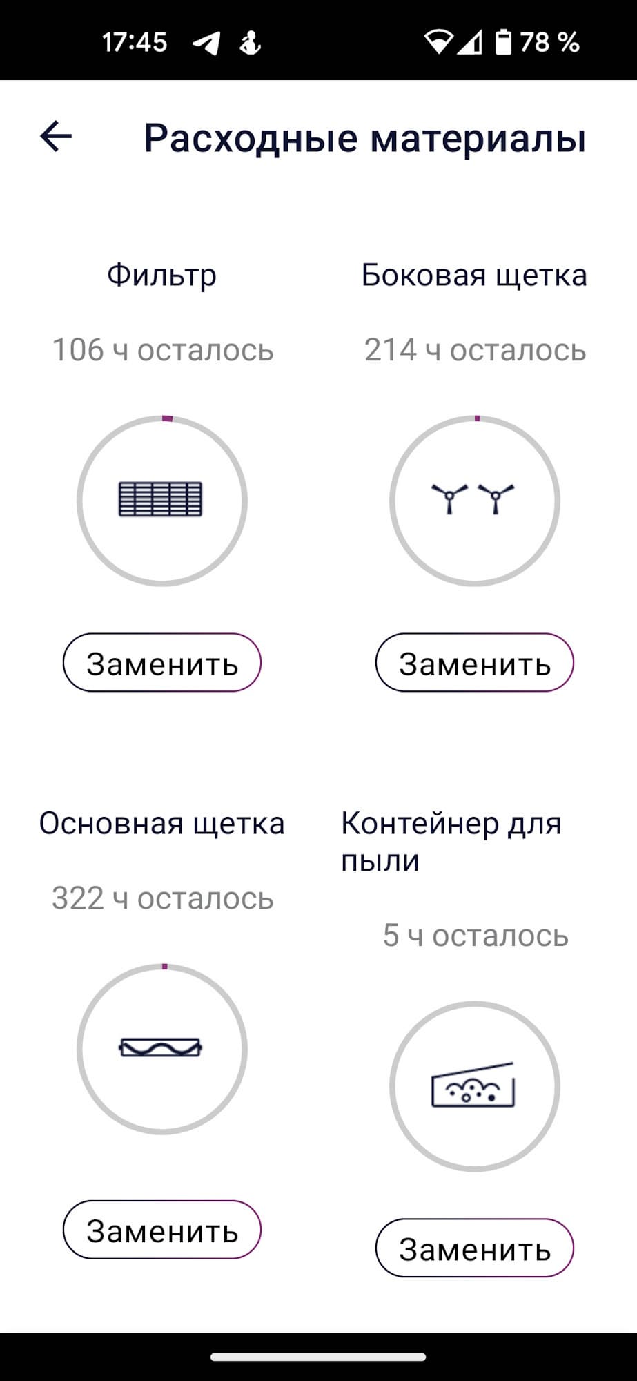 Управление осуществляется либо одной кнопкой — это самый простой вариант, либо пультом ДУ, либо — и это тоже оказалось несложным — при помощи мобильного приложения, в которое объединяются все умные приборы бренда. Приложение позволяет настроить маршрут уборки, задать ее интенсивность, настроить расписание по дням недели и часам и уточнить другие необходимые нюансы. Кроме того, можно ознакомиться с историей уборок и узнать ресурс расходников — фильтров, боковых щеток, основной щетки, а также узнать, не пора ли очищать мусоросборник. В приложение придет уведомление, если пылесос застрянет или если его щетки заблокируются. Но и сам робот не станет молчать: о своих действиях, как и о состоянии беспомощности, он сообщает различными звуковыми сигналами.