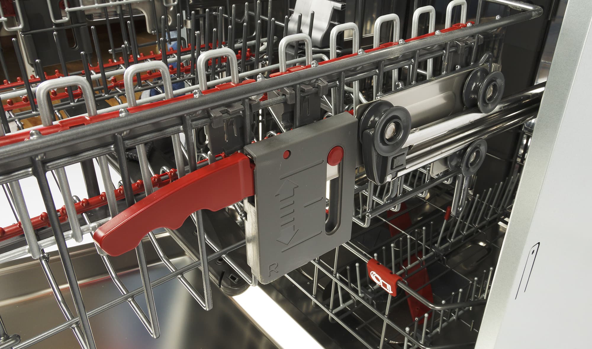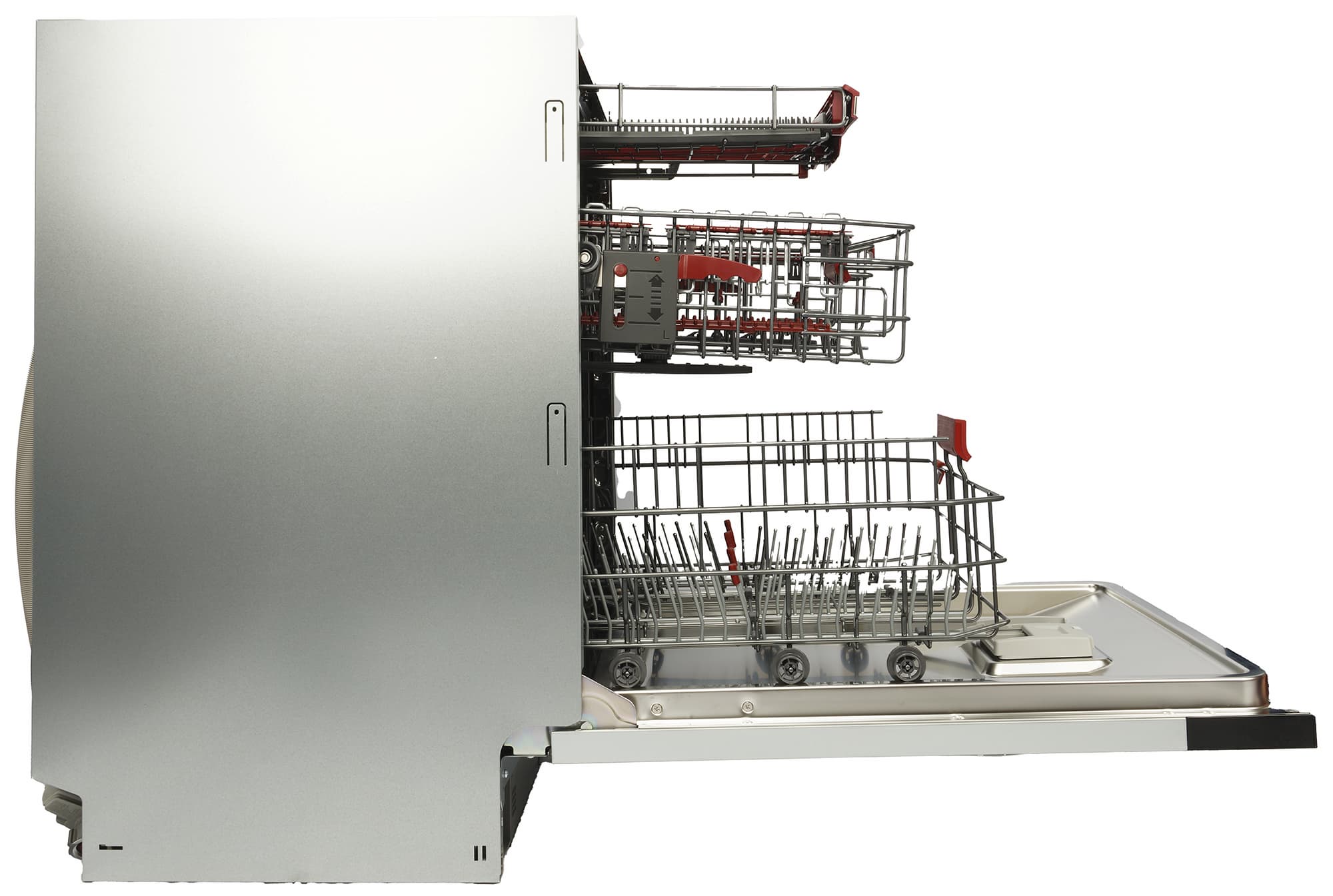 У средней корзины два положения: чтобы опустить или поднять емкость при необходимости размещения крупной посуды, следует воспользоваться удобными пластиковыми рычагами на боковых сторонах.