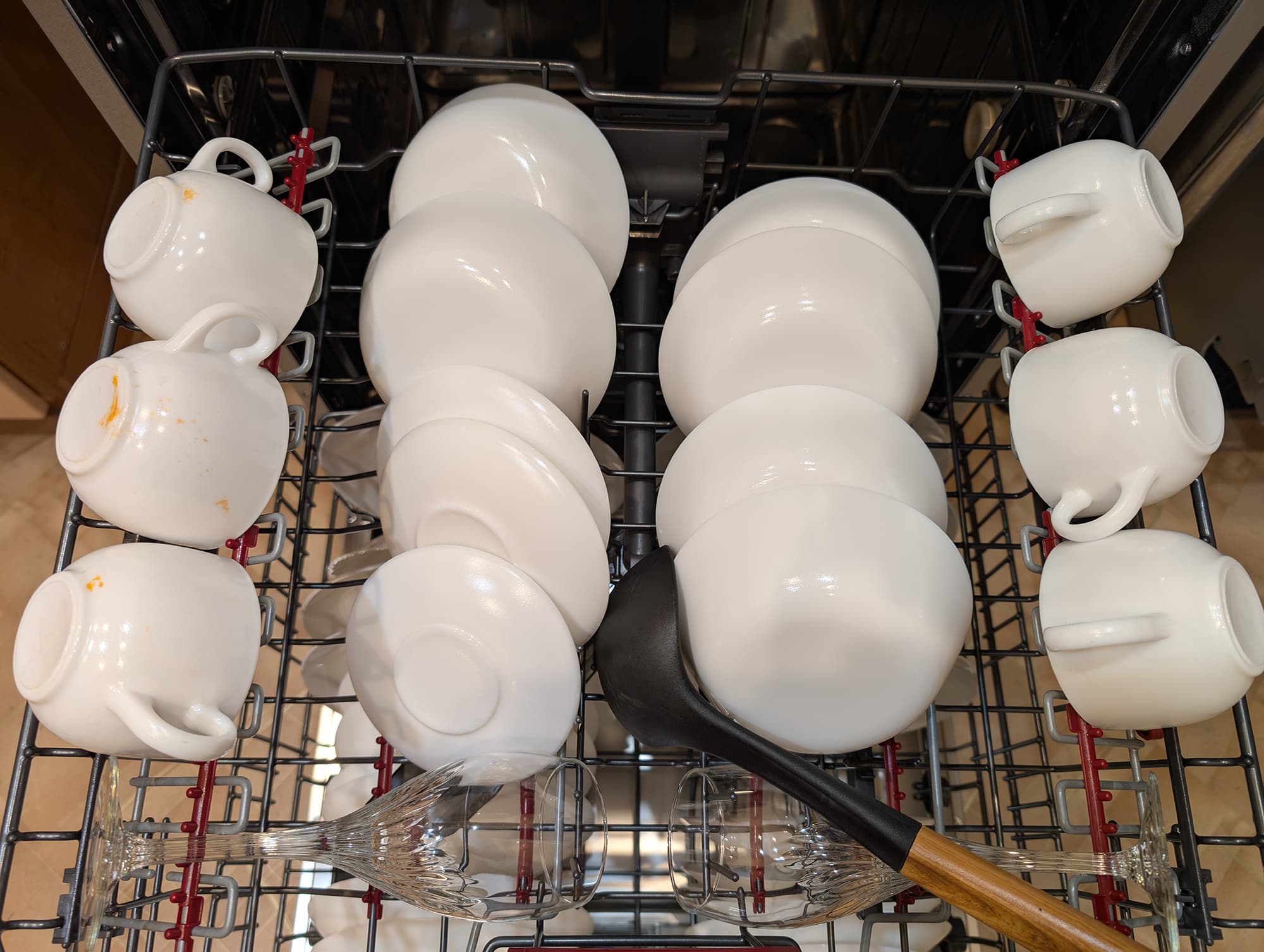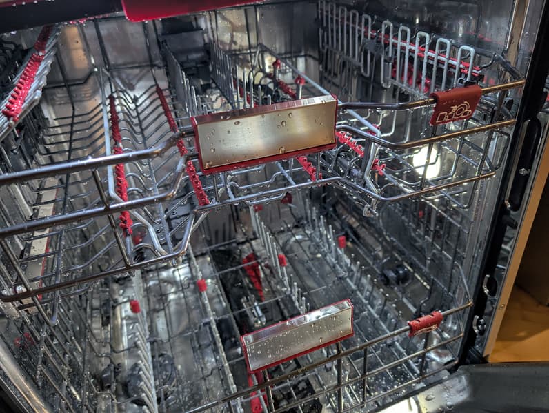 Небольшой огрех, впрочем, нашелся: на донцах чашек, размещенных на левой откидной полке средней корзины, остались незначительные следы нашей смеси.