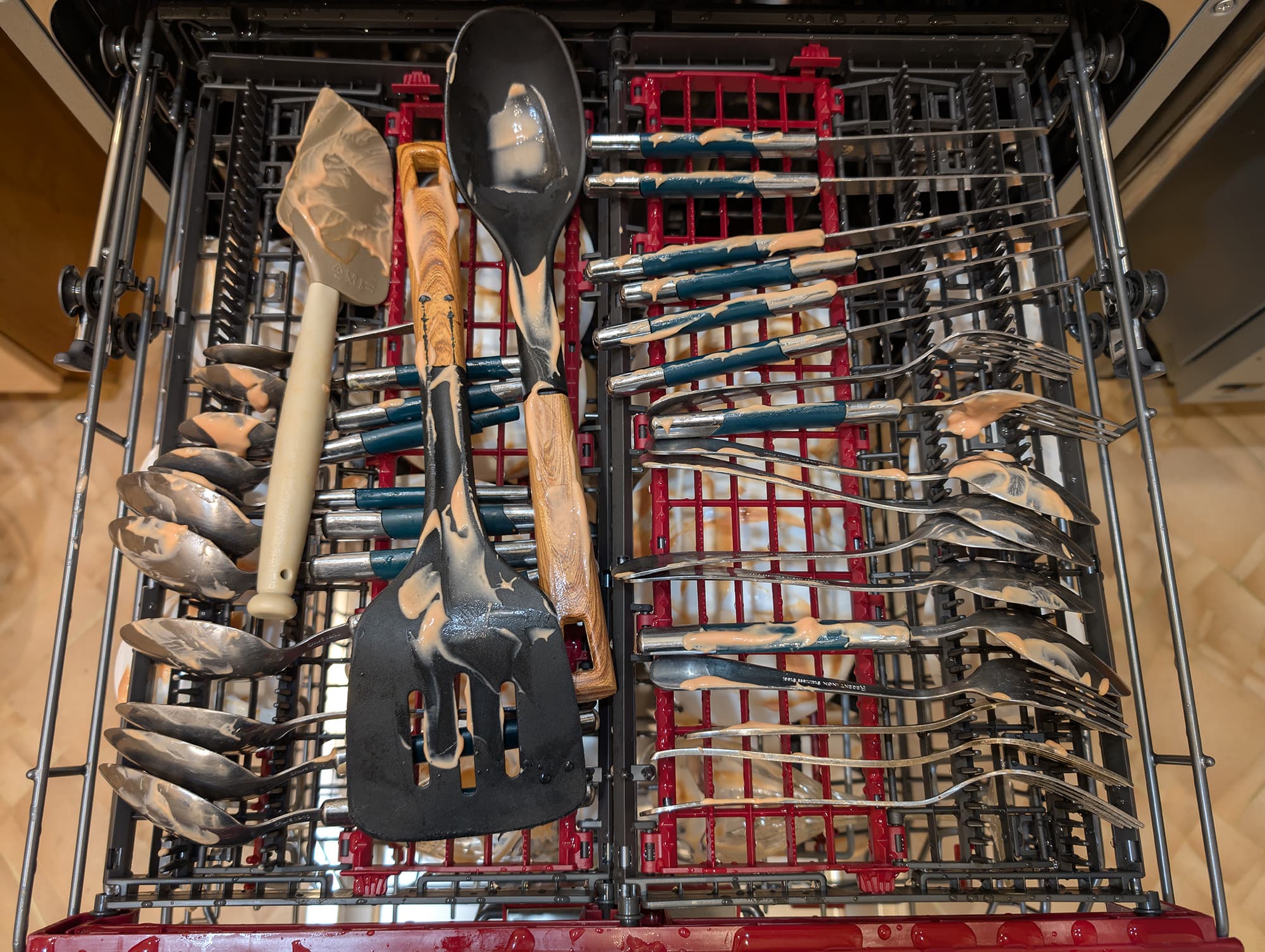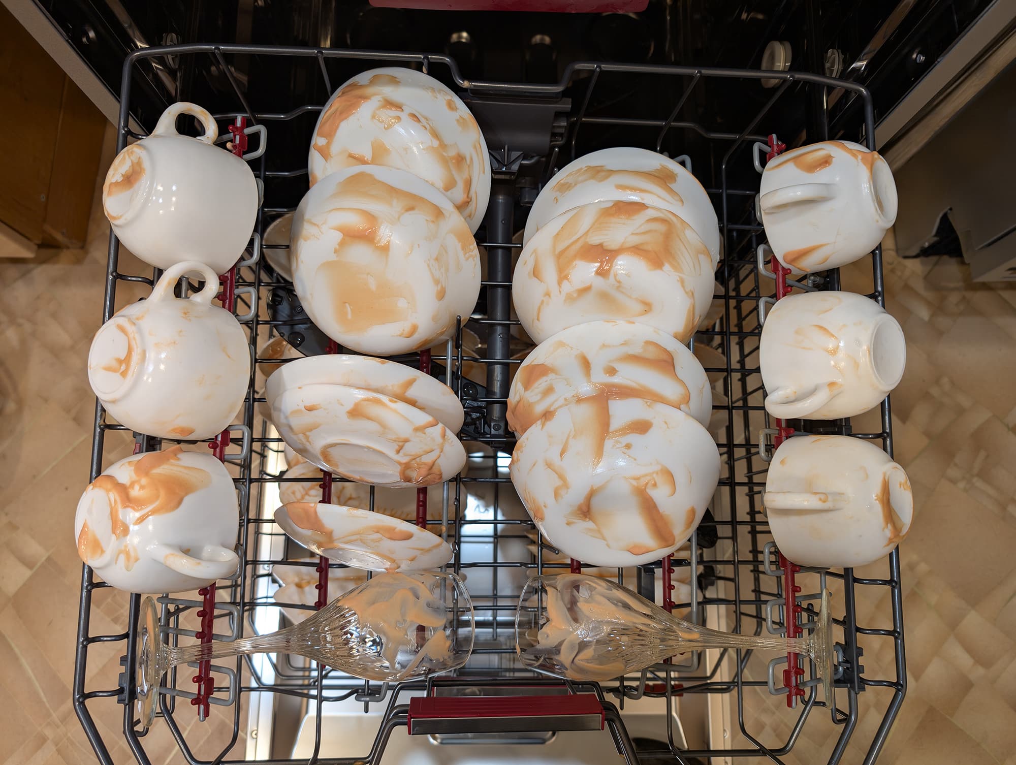 Как обычно, в ход пошла идеальная грязь: простая смесь майонеза и кетчупа — но есть некоторые нюансы. Посуду, которую мы густо ею покрыли, засыхала в течение суток. После этого мы разместили ее в корзинах и на полке для столовых приборов, не слишком заботясь об аккуратности расстановки.