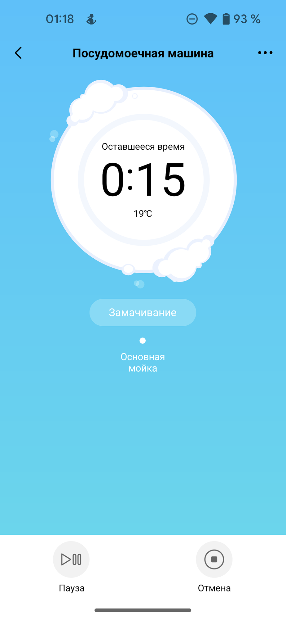 Во время выполнения сценария приложение показывает время, оставшееся до его окончания, и текущий этап мытья. Приостановить или прервать программу можно кнопками в нижней части экрана.