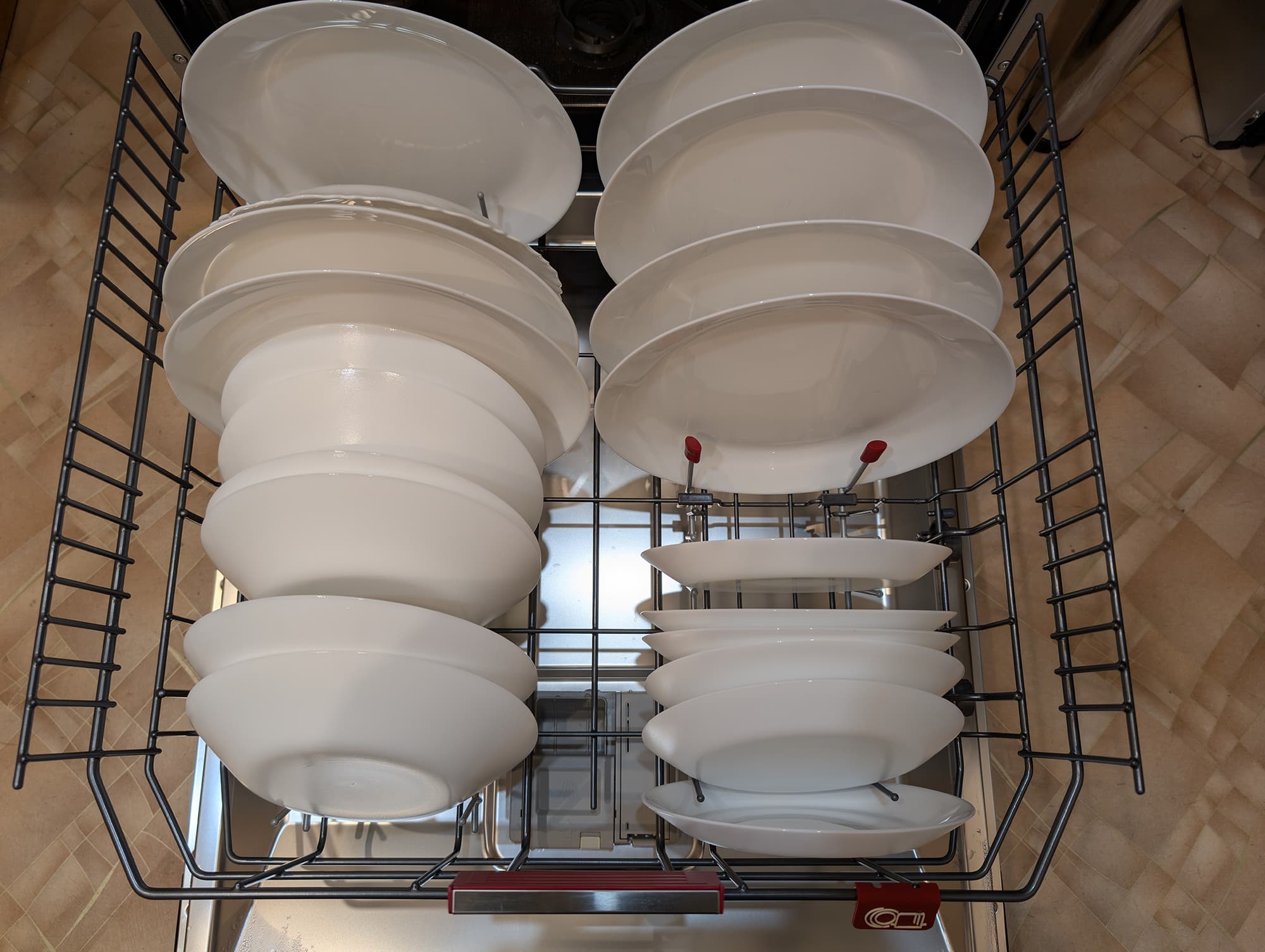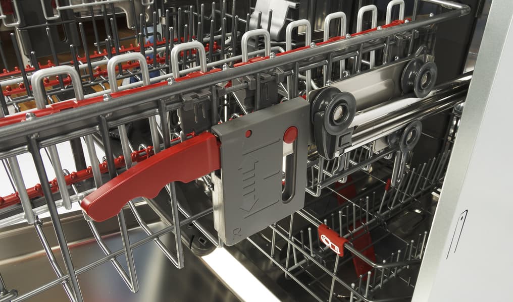 Приглядевшись, мы поняли, что в недостаточно тщательной промывке виноваты сами: хотя средняя корзина, оставленная в верхнем положении, задвигалась без проблем и не зацепляла посудой за верхнюю полку, небольшое расстояние между приборами не позволяло эффективно промыть фарфор. В данном случае следовало опустить корзину в нижнее положение.
