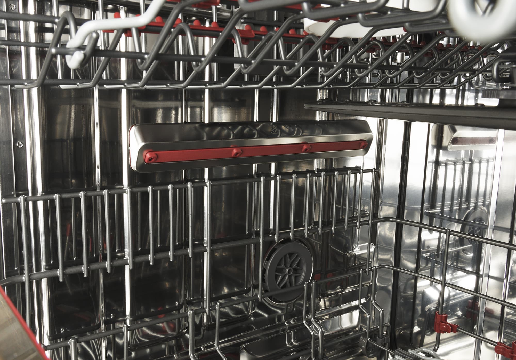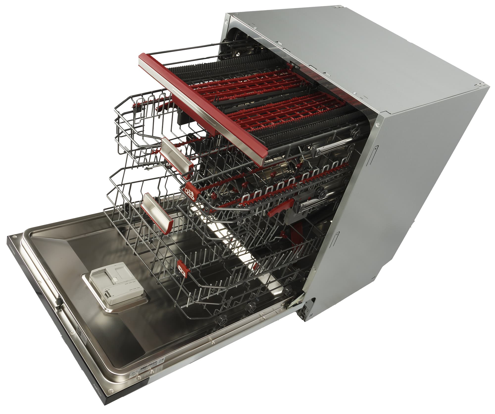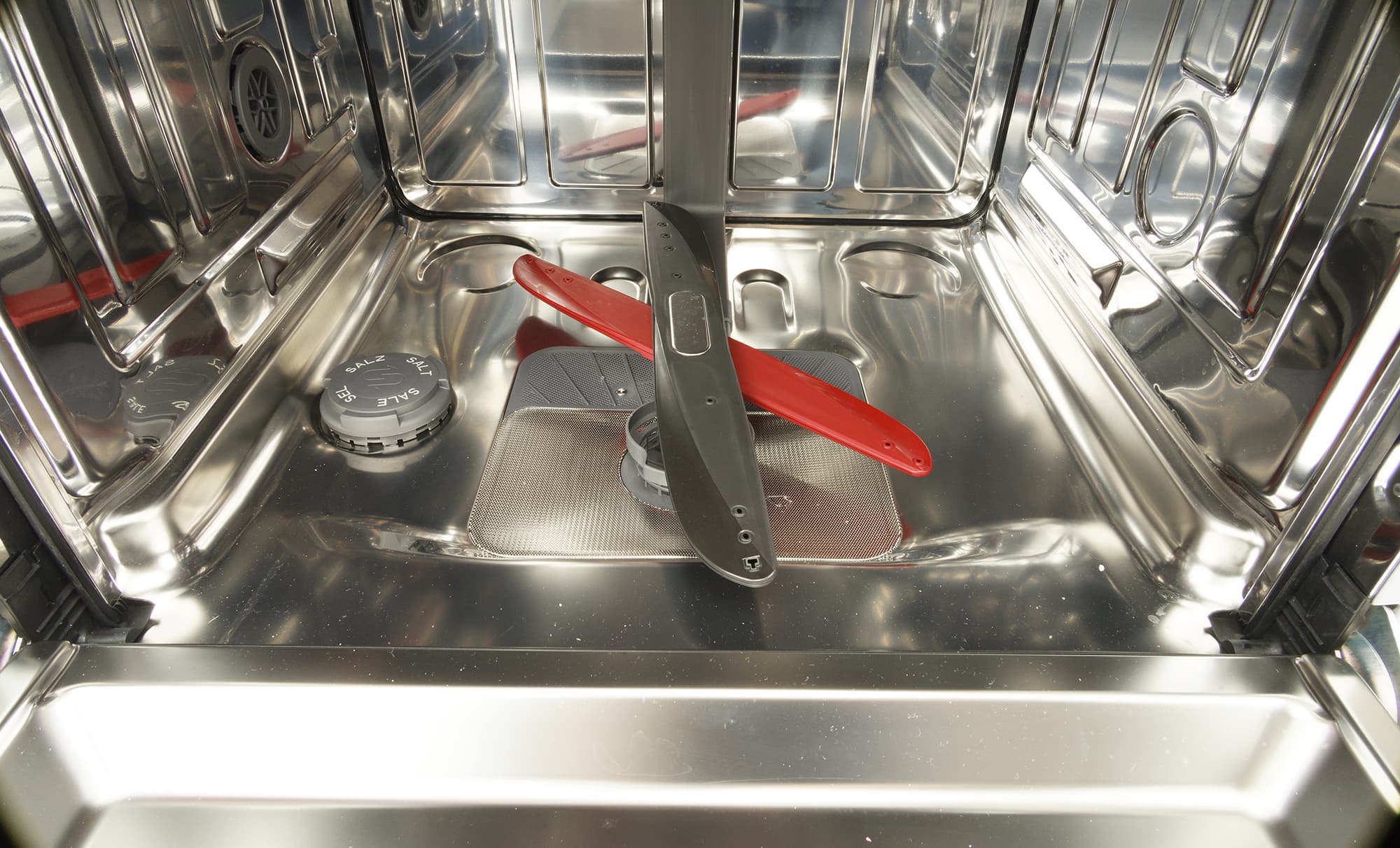 Бак машины целиком сделан из нержавеющей стали. На полу емкости мы видим фильтр традиционной конструкции и горловину смягчителя. в которую засыпается специальная соль. У этой модели два нижних разбрызгивателя вместо привычного одного: импеллеры вращаются в противоположных положениях, что позволяет добиться большей эффективности мытья и полоскания.