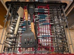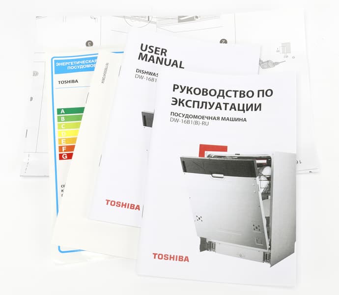 У этой модели три корзины: верхняя предназначена для столовых приборов, нижняя — для крупной посуды, кастрюль, сковород и подносов, а средняя — для десертных тарелок, чашек, блюдец и хрупких предметов. По данным производителя, Toshiba DW-16B1(B)-RU вмещает до 16 комплектов: на два больше, чем большинство полноразмерных посудомоек.