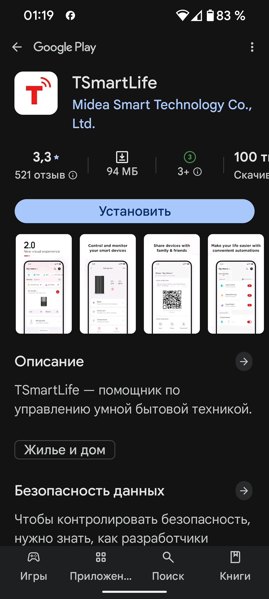 Для работы с посудомоечной машиной производитель предлагает нам воспользоваться приложением TSmartLife (Midea Smart Technology). На момент подготовки обзора программный продукт имеет рейтинг 3,3 из 5 на основе 521 отзыва и насчитывает более 100 тысяч скачиваний.