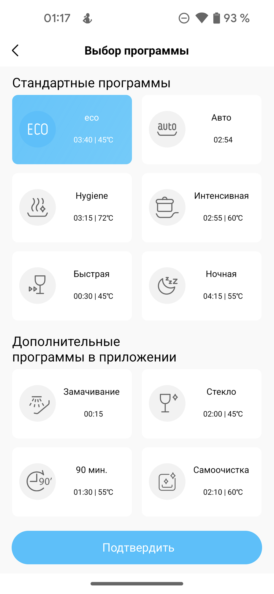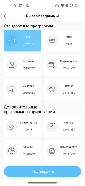 Как мы уже упоминали, к стандартным, доступным с панели управления, программам приложение добавляет еще четыре: пятнадцатиминутное ополаскивание, сценарий для стекла, 90-минутное быстрое мытье и режим самоочистки.