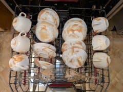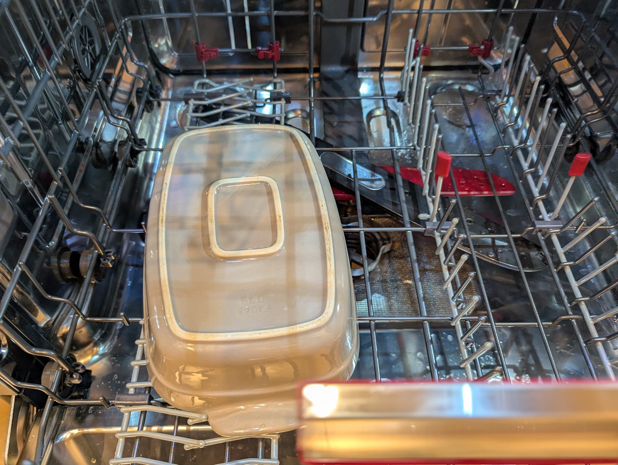 Для испытаний программ усиленного мытья мы применяем большие толстостенные керамические формы, в которых запекается мясо под сметанным соусом.