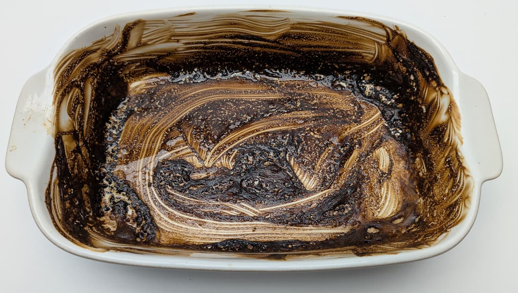Для закрепления эффекта мы дополнительно нагреваем опустошенную емкость с остатками соуса до образования стойкой коричневой корки, не ополаскивая и не замачивая посуду.