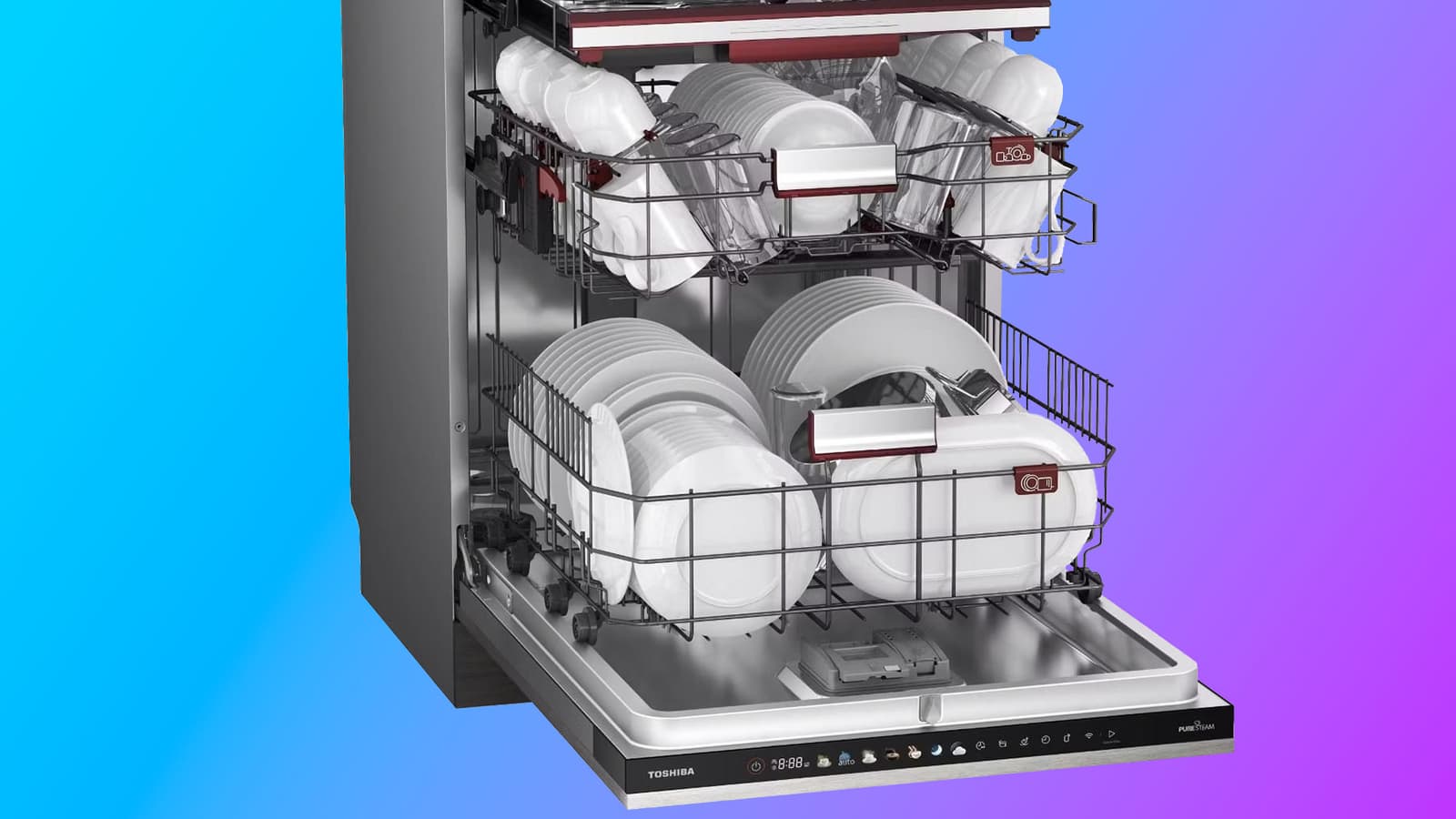 Полноразмерная посудомоечная машина Toshiba DW-16B1(B)-RU, с которой мы познакомим вас сегодня, оснащена тремя корзинами для посуды и столовых приборов, оборудована внутренней подсветкой и функцией обработки паром и может управляться с помощью мобильного приложения.