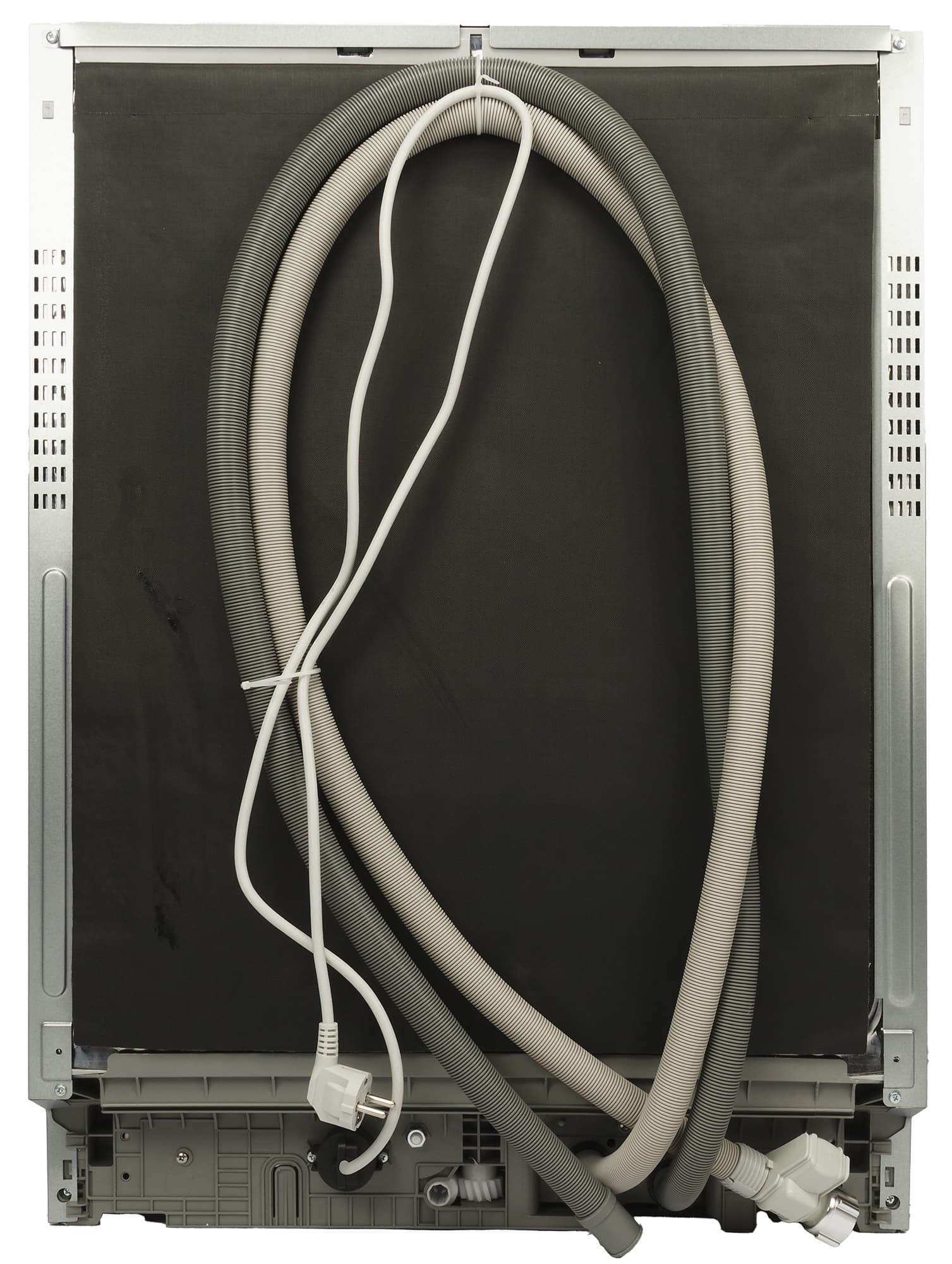 Сливной и заливной шланги уже установлены на посудомойке и закреплены вместе с электрошнуром на задней стенке. Заливной шланг оборудован системой от протечек при повреждении — клапаном AquaStop.