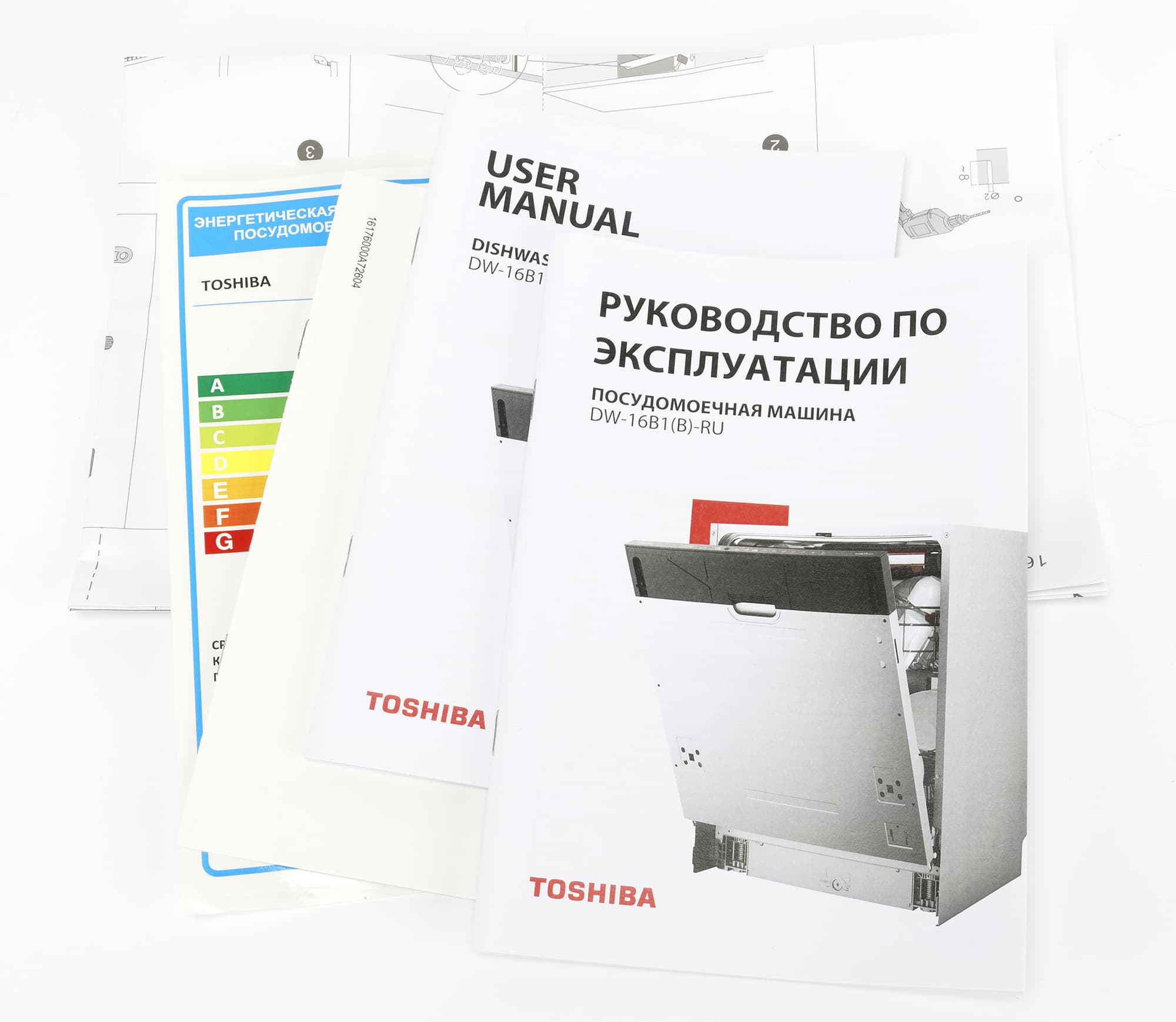 В комплект документации входят два экземпляра руководства по эксплуатации, на английском и русском языках, гарантийный талон, наклейка с информацией об энергетической эффективности устройства и большой лист бумаги с инструкцией по установке.