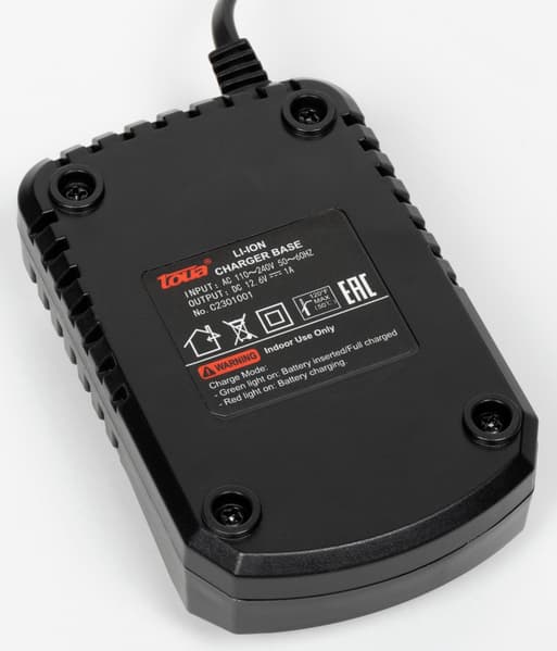 Прилагаемое зарядное устройство представляет собой некрупную станцию на 100—240 В с выходом 12 В/1,0 А. Во время зарядки светодиод станции отображает текущий режим или неполадку (неисправность или перегрев батареи). По завершении зарядки цвет индикатора меняется на зеленый с постоянным свечением.