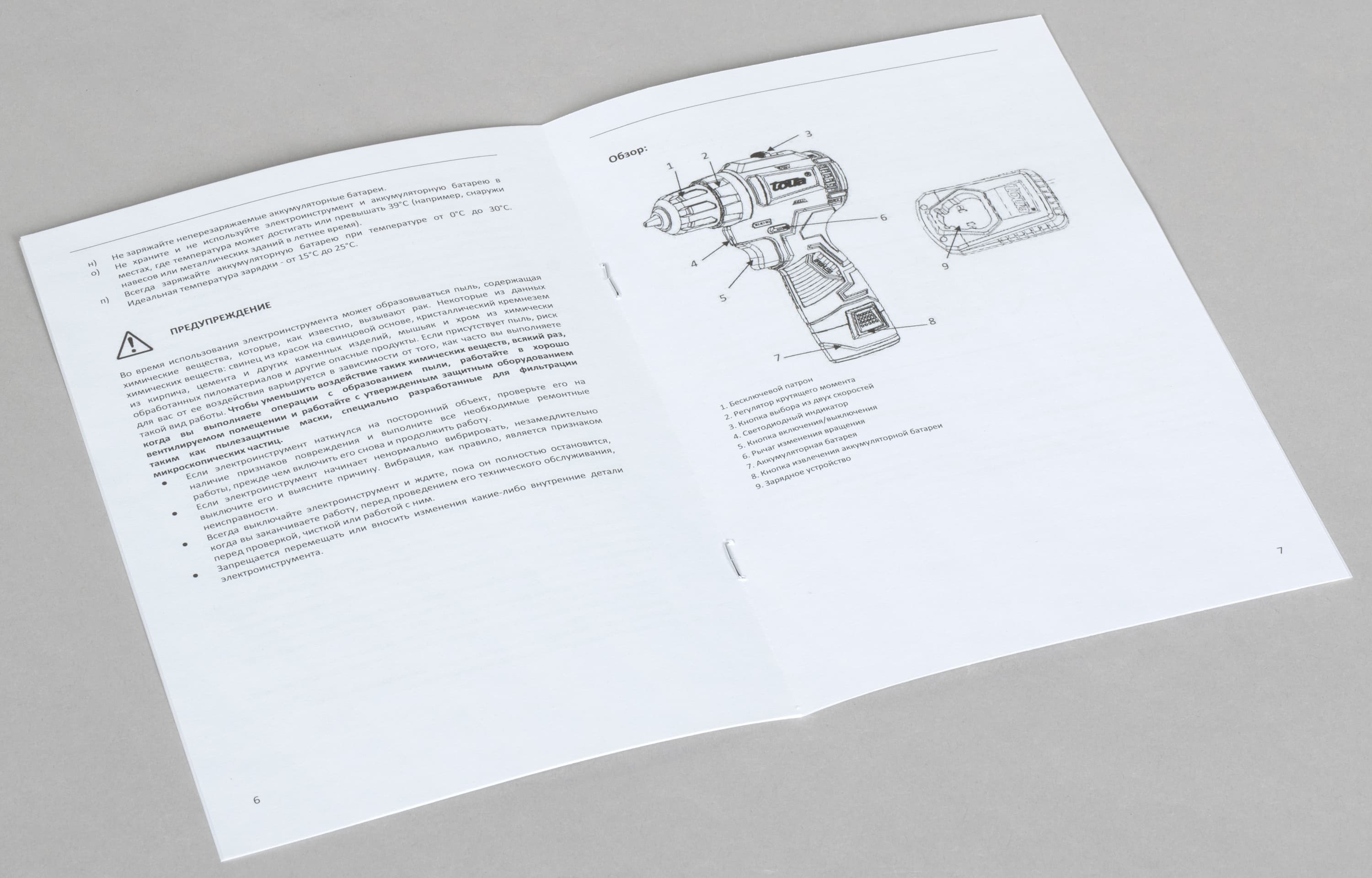 Прилагаемая инструкция, как нынче водится, содержит уйму ненужной пользователю информации: меры безопасности (какая тут может быть опасность при 12 вольт?), советы по уходу и т. д. Вообще, стандартный шуруповерт, не имеющий никаких электронных изысков (а такие модели существуют), вряд ли нуждается в инструкции. Но законодательство требует, ничего не поделаешь.