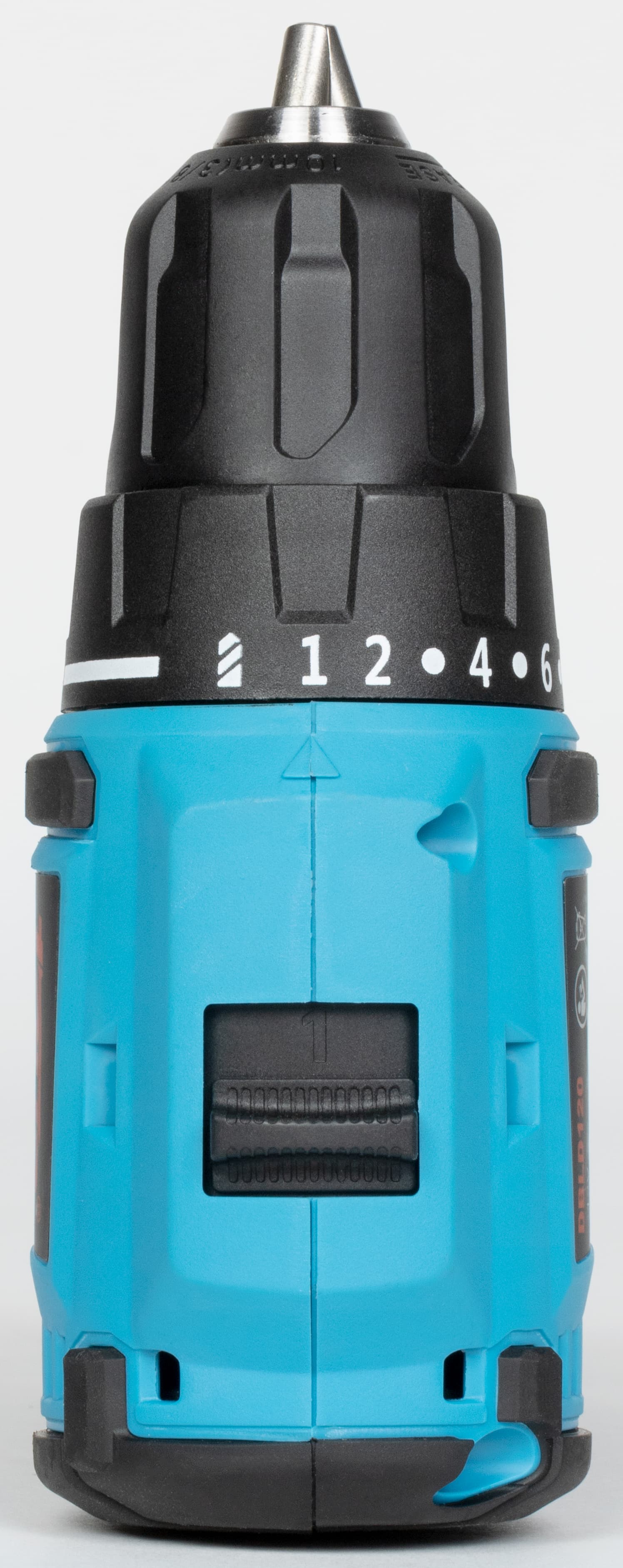 Диапазоны скоростей переключаются переключателем, расположенным сверху, как во всех шуруповертах. И снова, в который раз, мы видим трудноразличимые цифры в черном пластике ползунка. Цифры почти невозможно разглядеть даже на свету. Ну что вам, производителям, стоит капнуть чуток белой краски, чтобы цифры можно было видеть? Вы же используете краску на регулировочном кольце!