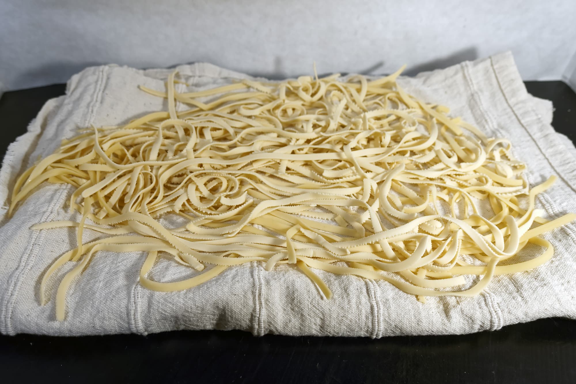 Лапша получилась ровной, достаточно тонкой и широкой. Правда, из-за перегрева некоторые нити, высыхая, легко ломались.