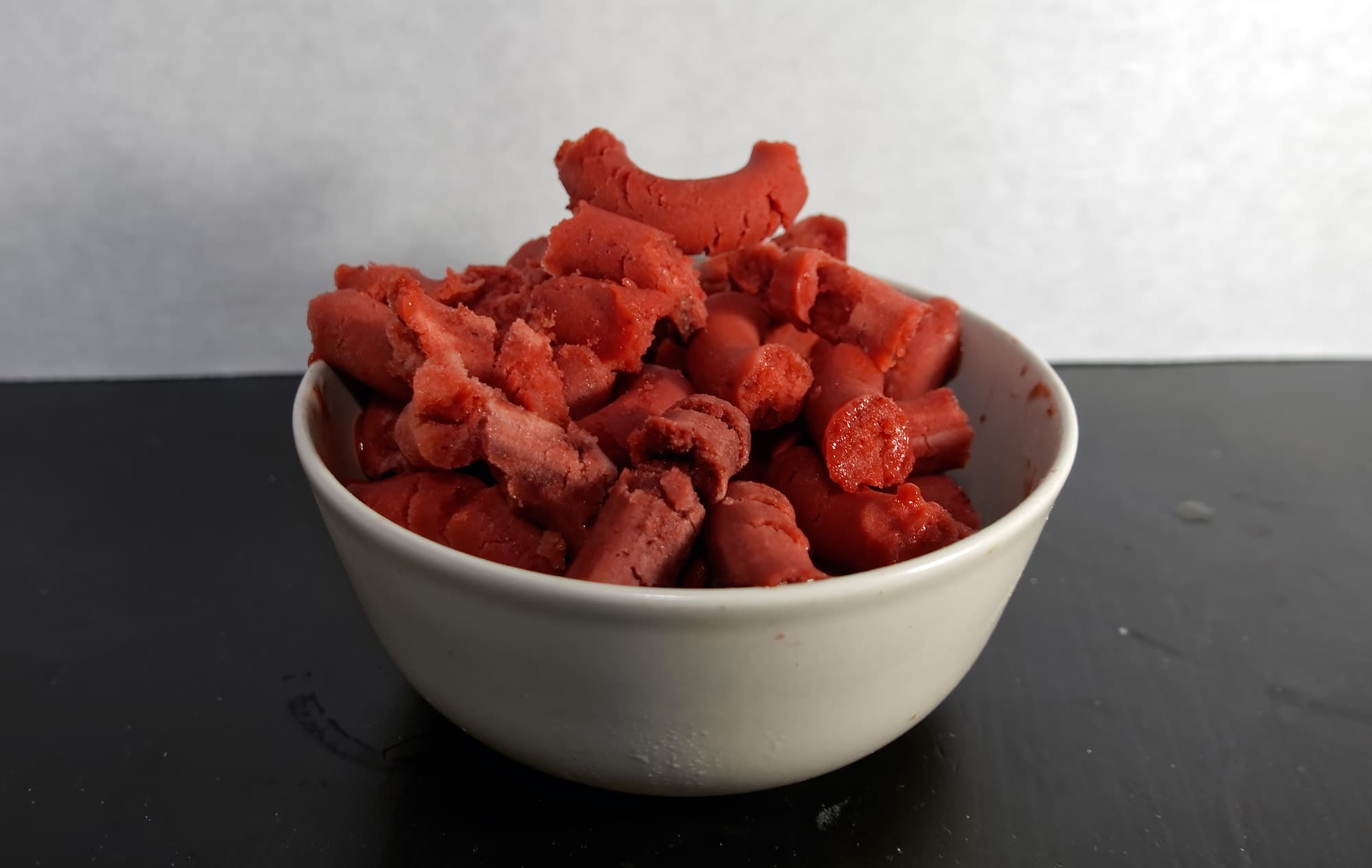 …Которые, впрочем, обычно бывают слишком короткими. Перемалывать замороженную клубнику — труд не из приятных. Это примерно как вручную молоть в гомогенную пасту куски айсберга. Можно, конечно, дать ягодам слегка оттаять, но тогда мы рискуем вместо ровного плотного сорбета получить отдельно — жижу, а отдельно — перемолотую мякоть.