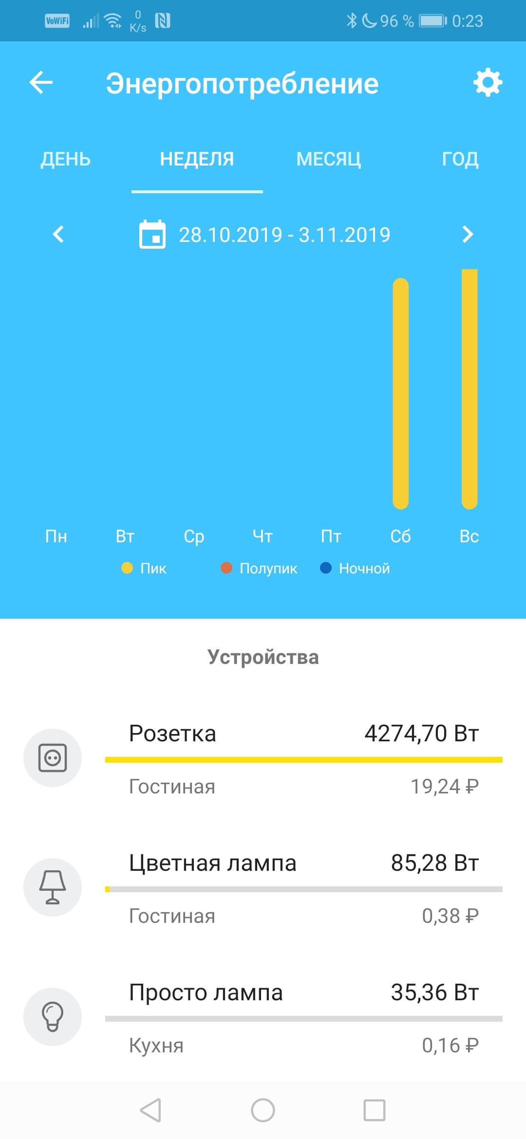 Еще одна архиполезнейшая функция скрывается в пункте Энергопотребление. Оказывается, умные лампы тщательно подсчитывают потребленную ими энергию, а умная розетка скрупулезно фиксирует весь прошедший через нее ток. А если пользователь не поленился внести сведения о стоимости электроэнергии, то рядом с потребленными ваттами будет отображена еще и их стоимость. Кстати, благодаря этой розетке автор осознал, насколько неэкономичен этот старый телевизор, один из первых жидкокристаллических, который подключен к розетке. Шутка ли, четыре киловатта за пару дней!