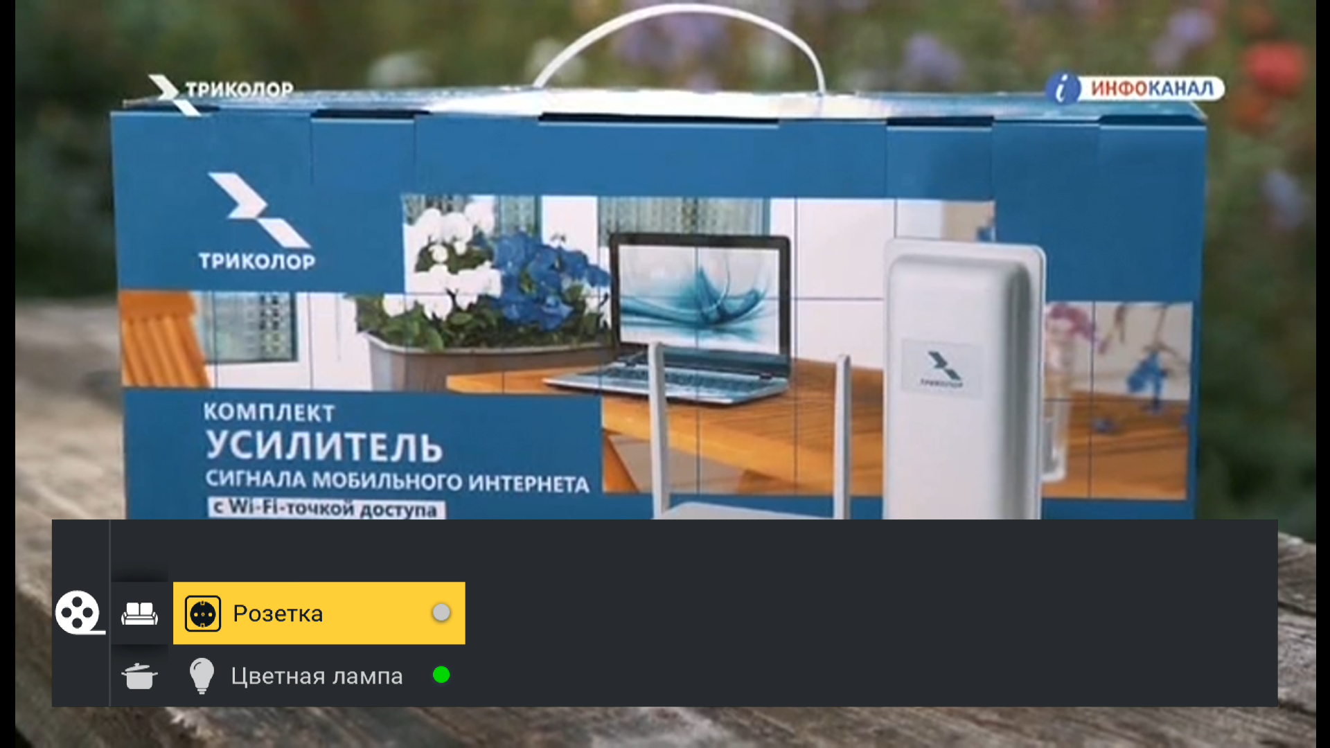 Управление работой устройств производится как через мобильное приложение (локально либо удаленно через интернет), так и непосредственно с телевизора. Здесь можно включить/выключить любую розетку, мигнуть лампочкой или изменить ее цвет и яркость, просмотреть текущее состояние приборов, узнать температуру и влажность в месте установки отвечающего за это датчика. Делать это можно в полноэкранном приложении Умный дом, либо вызвав модуль нажатием кнопки с часами на телевизионном пульте ДУ.