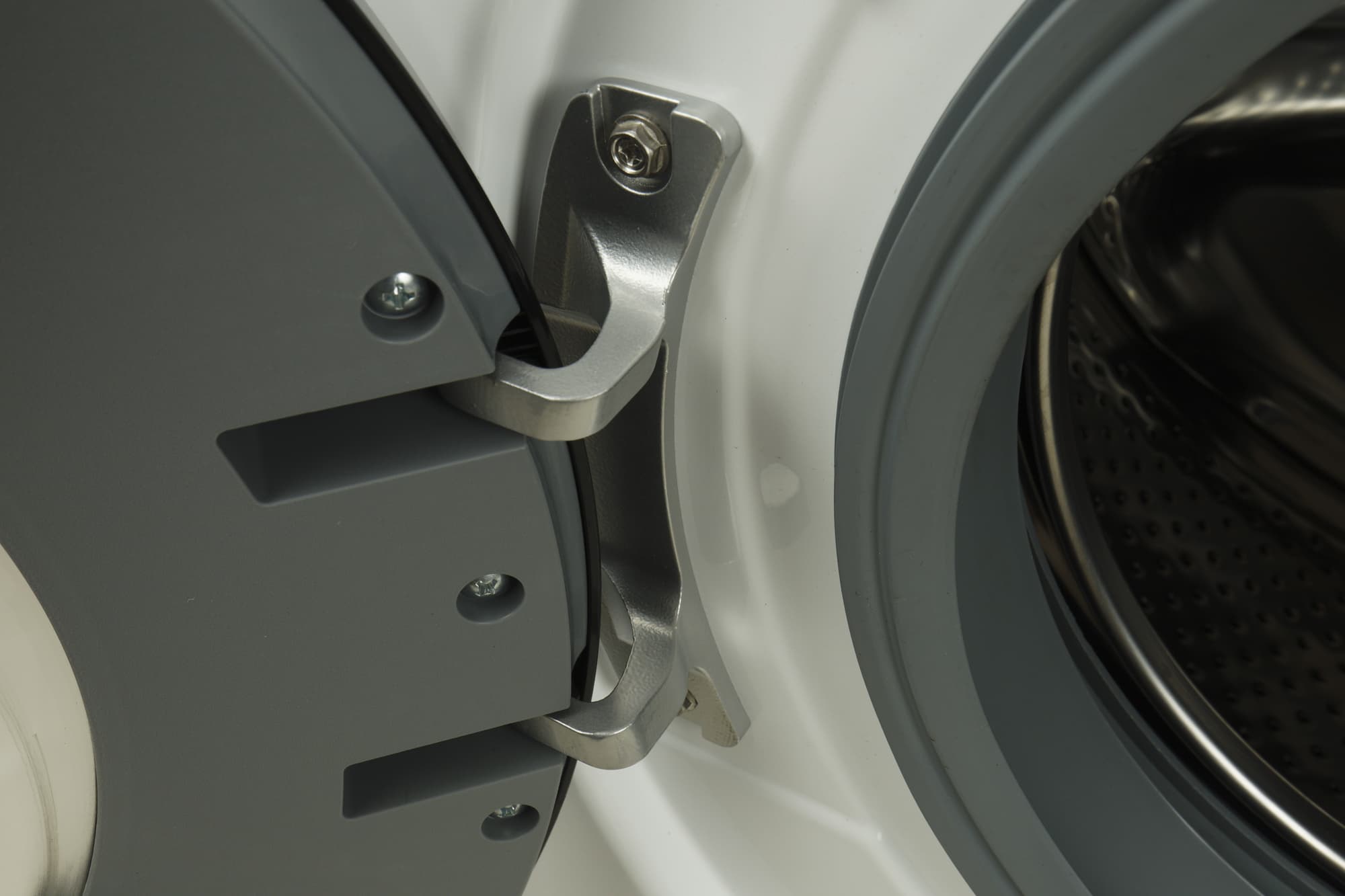 Начнем с самого начала: как только машину установят на выбранное место, ее надо сразу выровнять. Как и у большинства стиралок, это делается поворотом гаек на передних ножках — до тех пор, пока не будет достигнуто устойчивое горизонтальное положение.