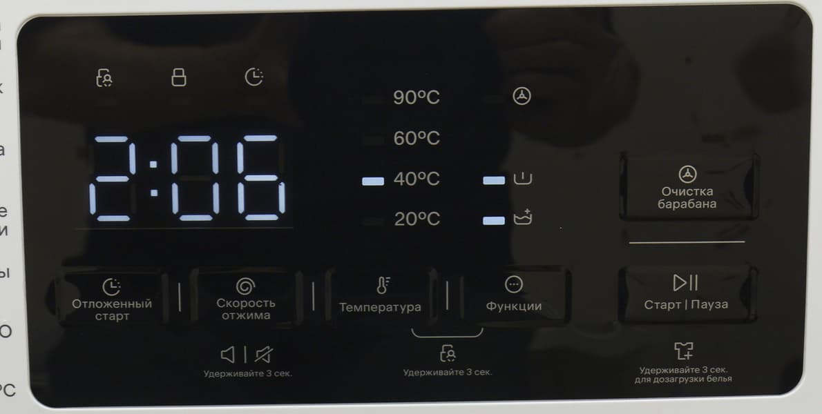 Под ней расположена кнопка «Старт/Пауза», запускающая сценарий и приостанавливающая его выполнение. Для разблокировки люка барабана для дозагрузки белья эту кнопку нужно удерживать в течение 3 секунд.
