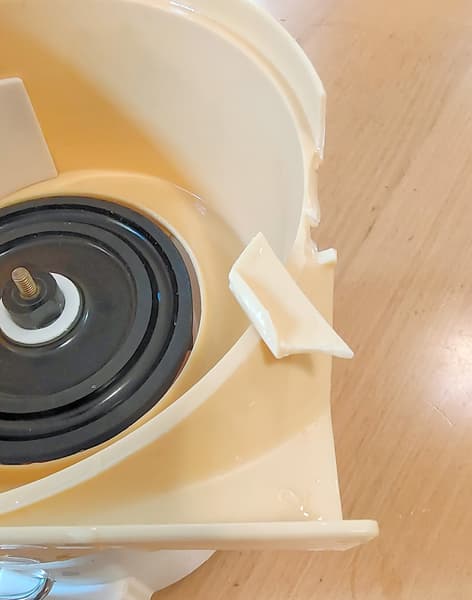 Увы, но пластмасса за 40 лет, видимо, тоже «устала» — после нескольких итераций сломалась ручка, переводящая соковыжималку из режима отжима в режим сброса жмыха.