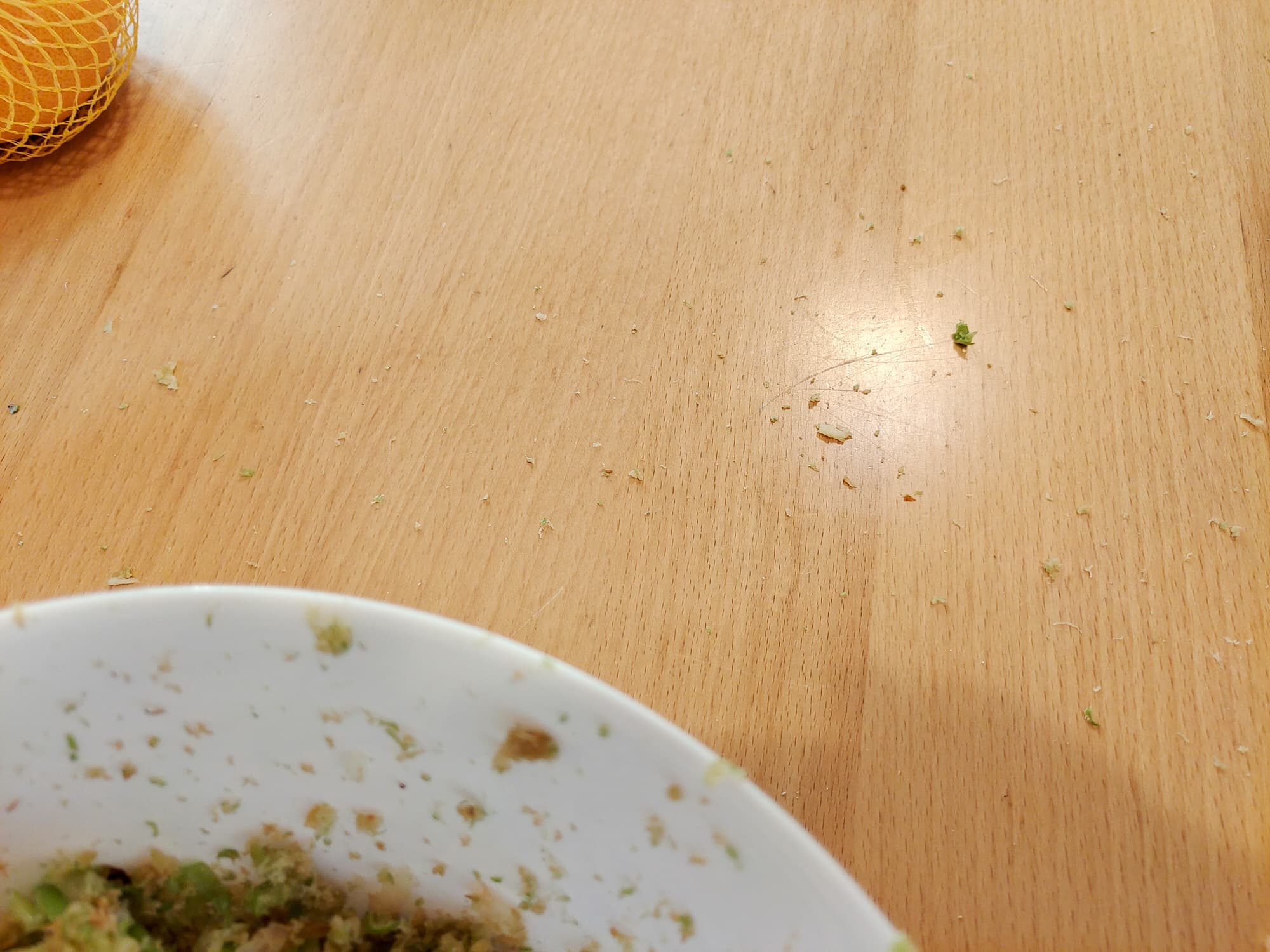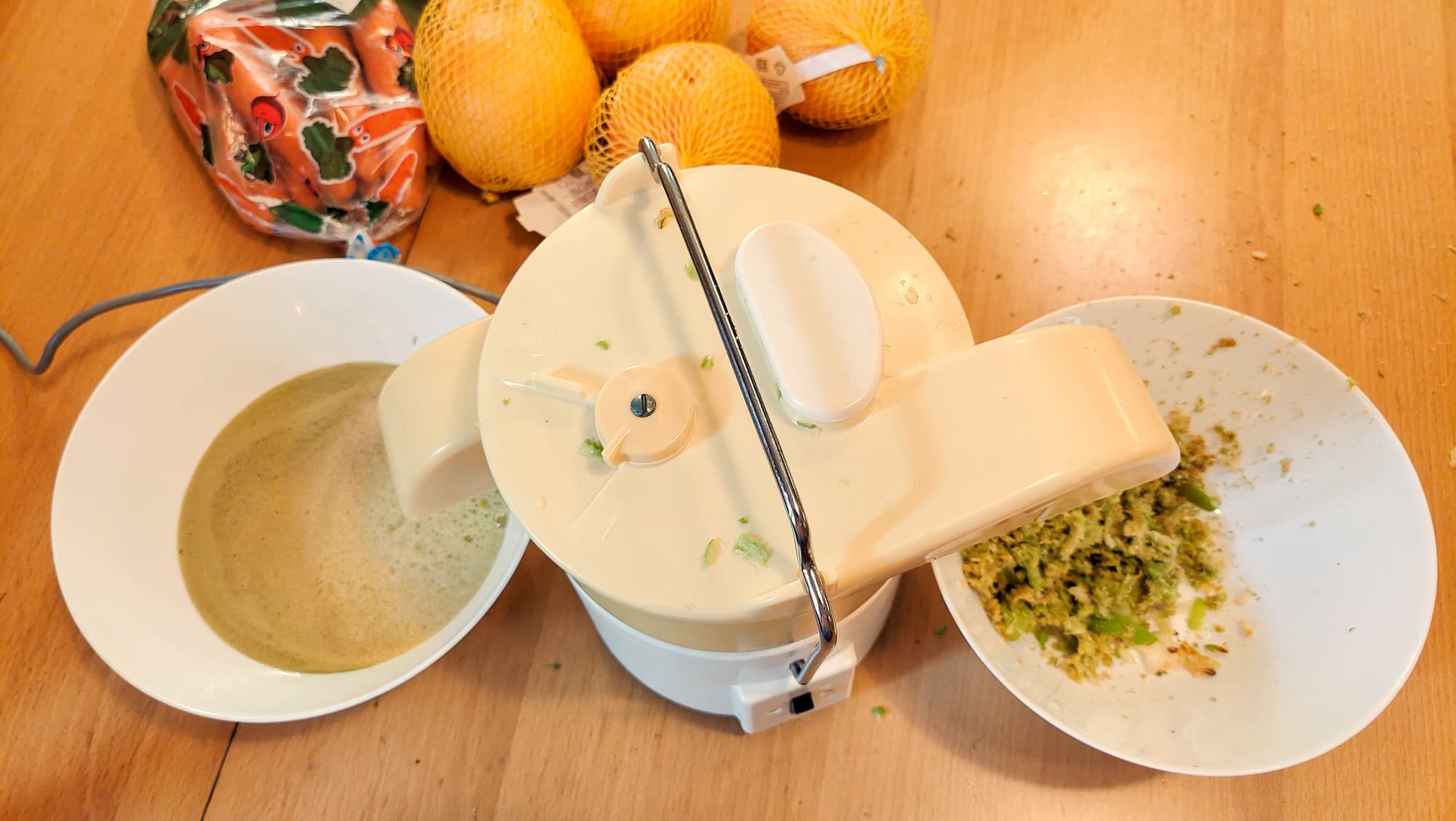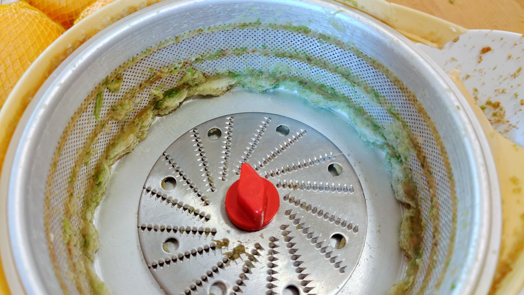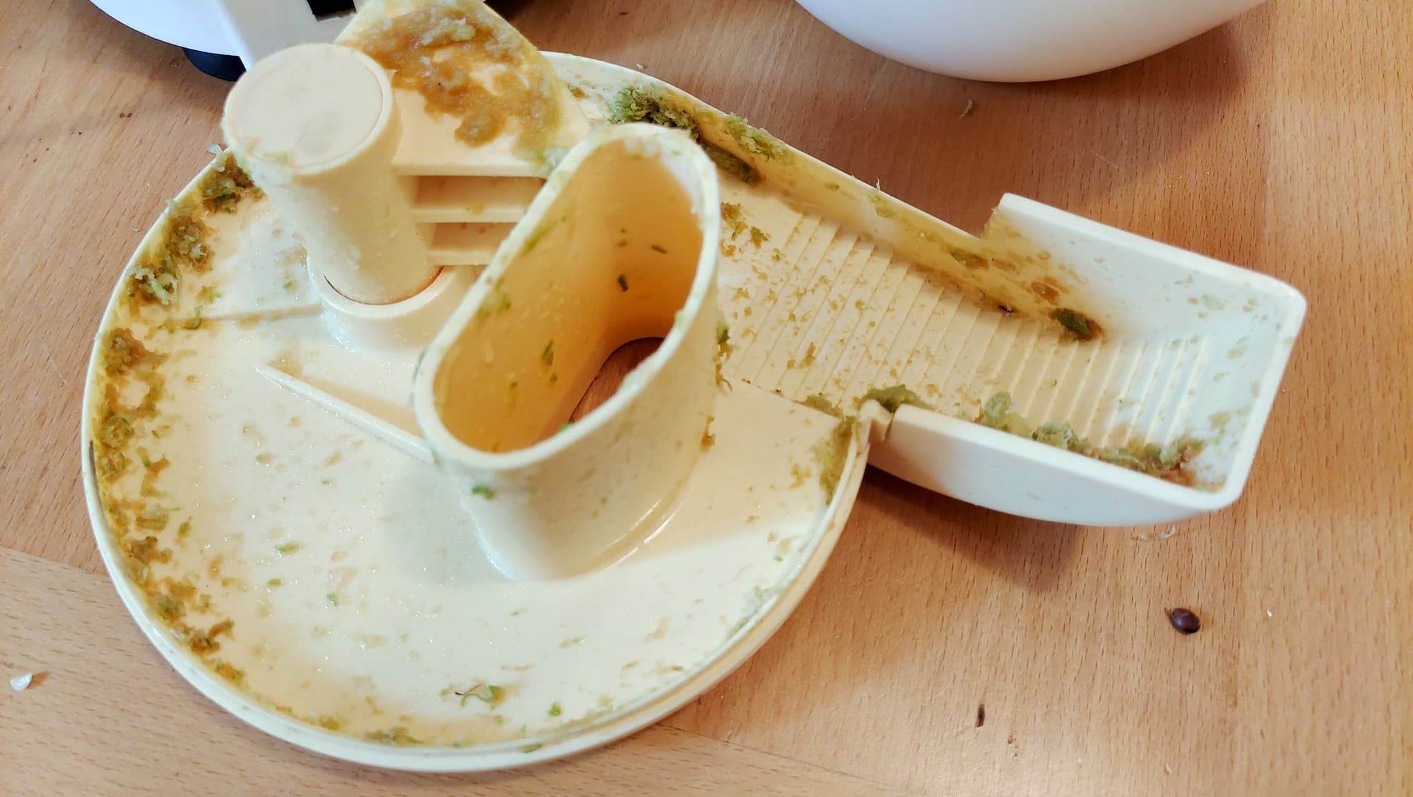 Оказалось, что раструб для выброса жмыха, в принципе, обозначает направление, в котором полетит его основная часть, но основная в данном случае вовсе не значит вся — мелкие «жмыхинки» разлетались за пределы краев нашей не самой маленькой салатной миски и равномерно распределялись по столу вокруг.