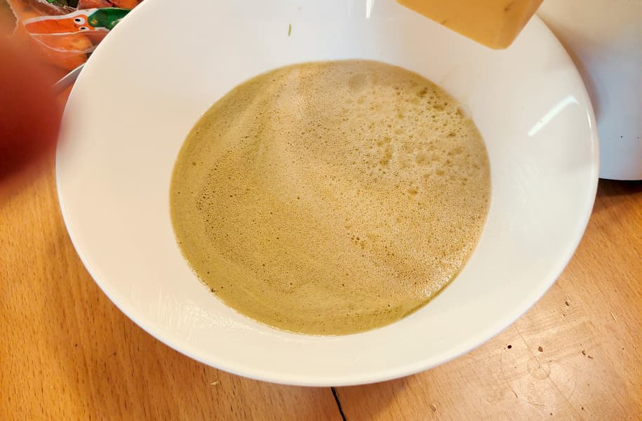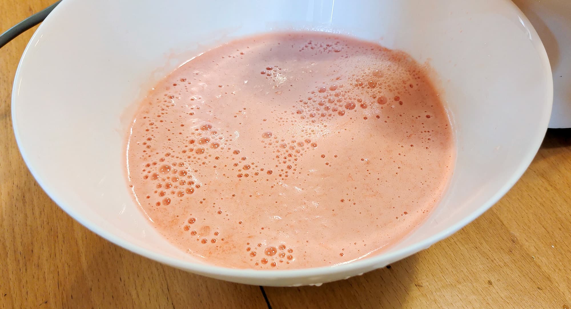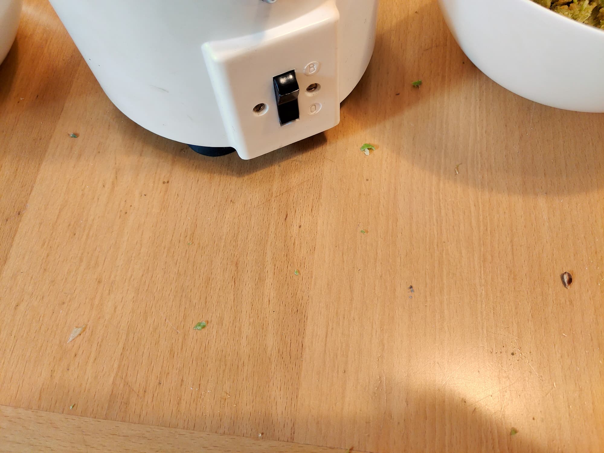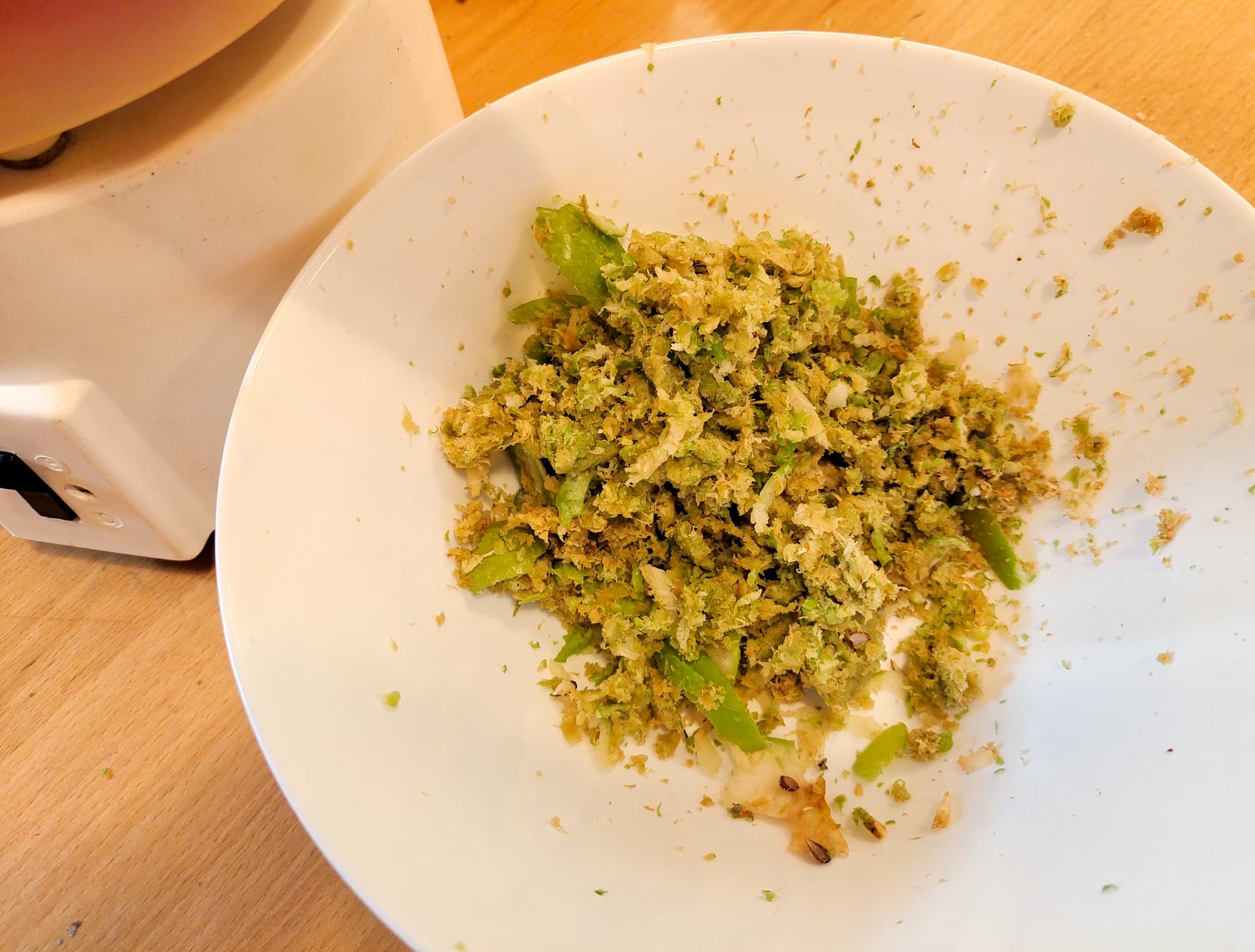Оказалось, что раструб для выброса жмыха, в принципе, обозначает направление, в котором полетит его основная часть, но основная в данном случае вовсе не значит вся — мелкие «жмыхинки» разлетались за пределы краев нашей не самой маленькой салатной миски и равномерно распределялись по столу вокруг.