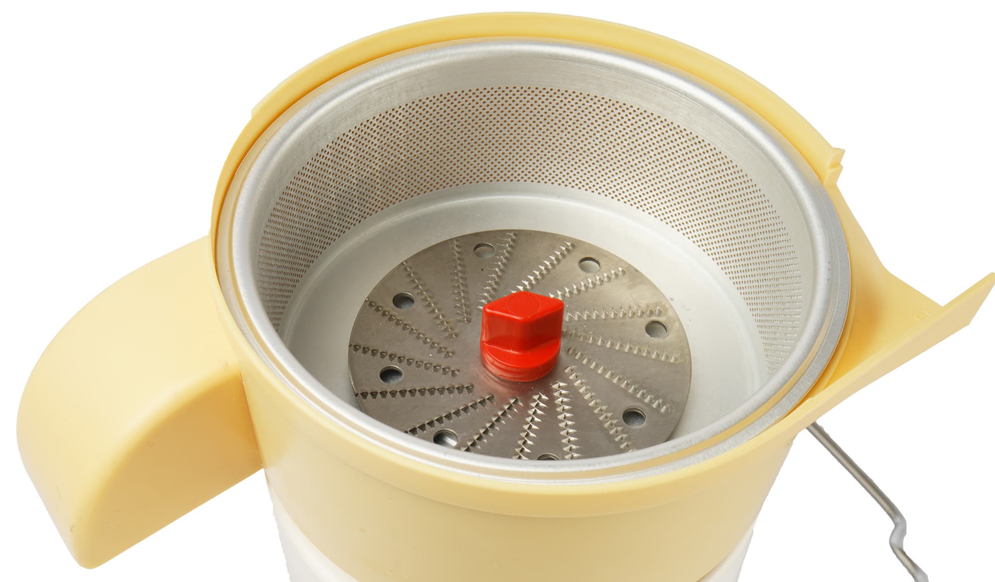 В отличие от привычных нам современных моделей, терочный диск и отжимной барабан представляют собой две независимых детали. Возможно, причиной тому послужило то, что отжимной барабан — алюминиевый, а терочный диск сделан из довольно толстой стали.