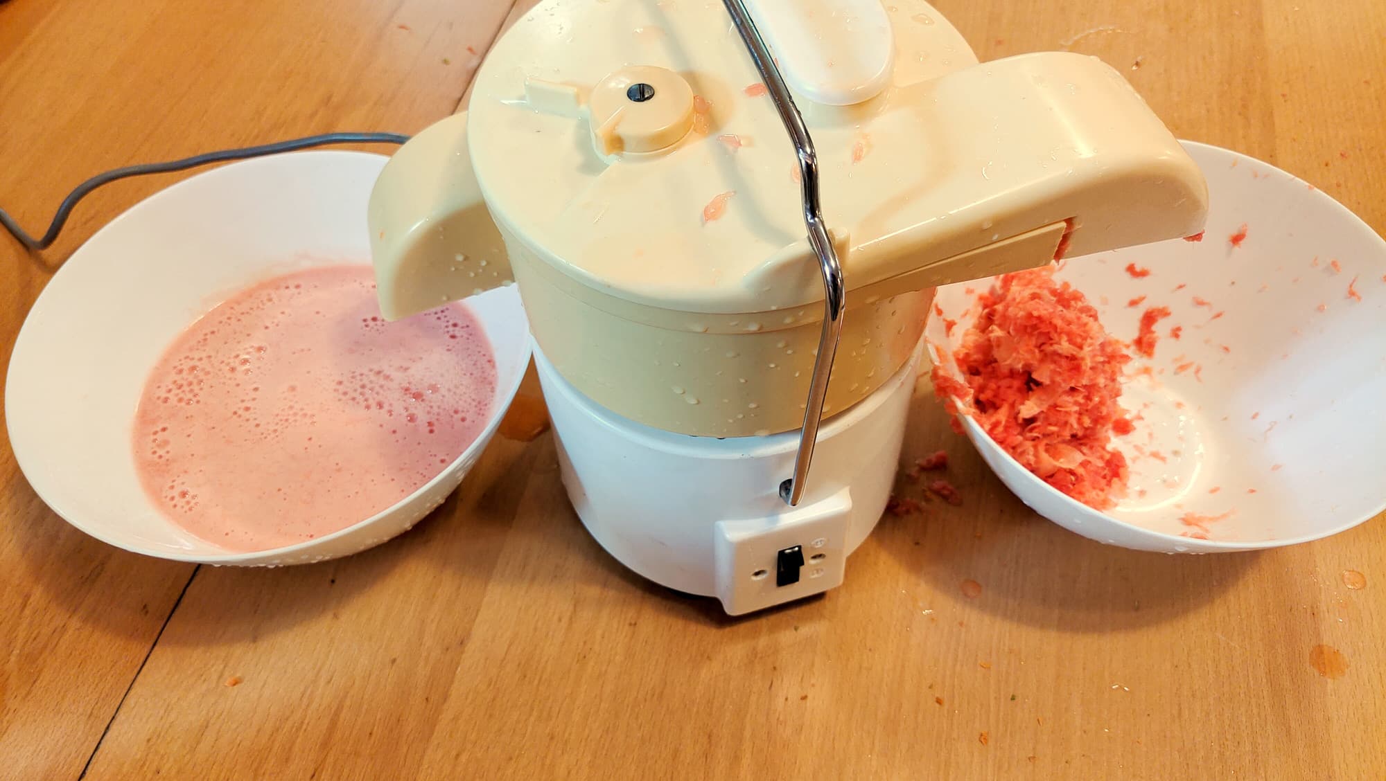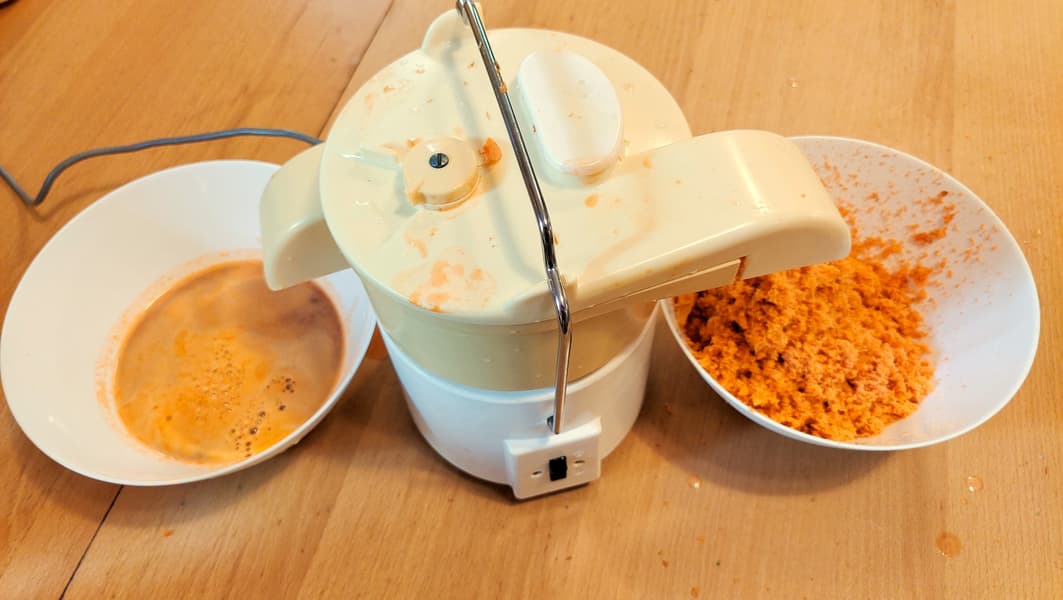 С морковью СВП-2 вела себя более прилично, чем с яблоками: необработанные кусочки вылетали обратно разве что пару раз, скачки по столу перешли с галопа на легкую рысь, да и сноровки у оператора прибавилось. За 5 минут 38 секунд удалось отжать 397 граммов сока.