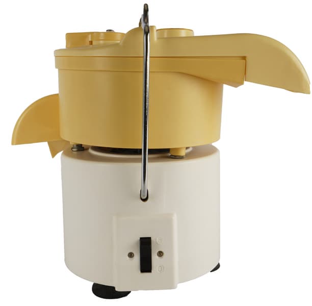 Взглянув на отжимной барабан, мы пришли в недоумение: у него практически вертикальные стенки — как же будет отбрасываться жмых? Решение конструкторов нельзя назвать гениальным, но некоторая степень оригинальности ему присуща: с помощью специальной ручки вниз опускается этакий «ковш», который подгребает жмых и выкидывает его наружу через специальное отверстие. Таким образом, процесс отжима у нашей соковыжималки разделен на два неодновременных действия: собственно отжим сока и выброс жмыха.