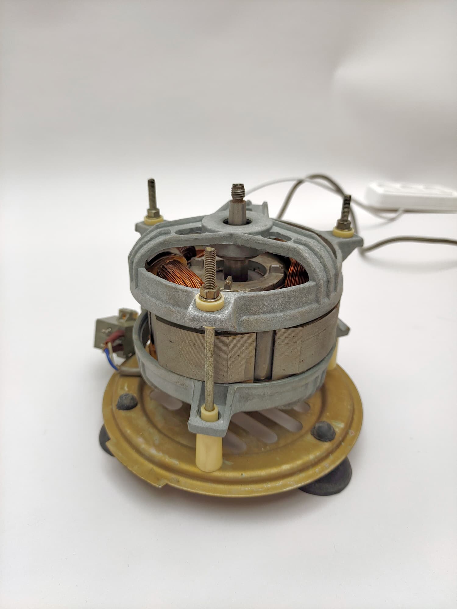 Впрочем, ничего интересного, кроме собственно мотора, внутри корпуса не было. Мотор, выключатель и провода — вот и все внутренности. Попытки провернуть вал двигателя вручную сразу же подтвердили догадку про смазку. Старую удалили, новую нанесли, соковыжималку собрали.