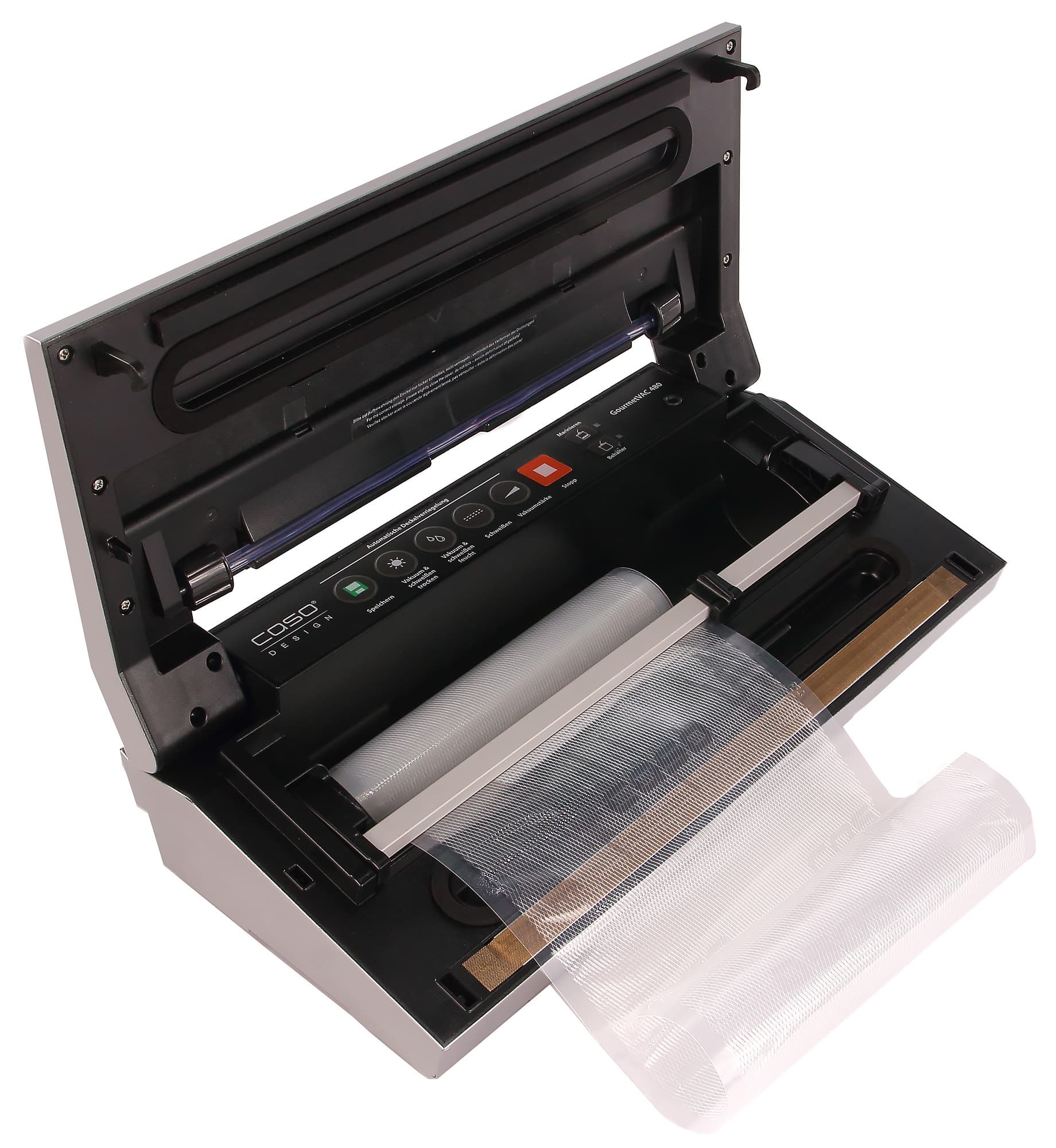 Еще одна характерная «полупрофессиональная» особенность упомянутой модели Caso GourmetVac 480 — запаковка пакета двойным, а не одинарным швом и автоматическая блокировка крышки. Не секрет, что в процессе упаковки пакетов время от времени на место запайки попадает влага, специи или части продуктов. В результате пакет не запаковывается с первого раза либо начинает «травить» воздух. Двойной шов позволяет свести число таких казусов к минимуму, что в итоге сэкономит и время, и расходные материалы.