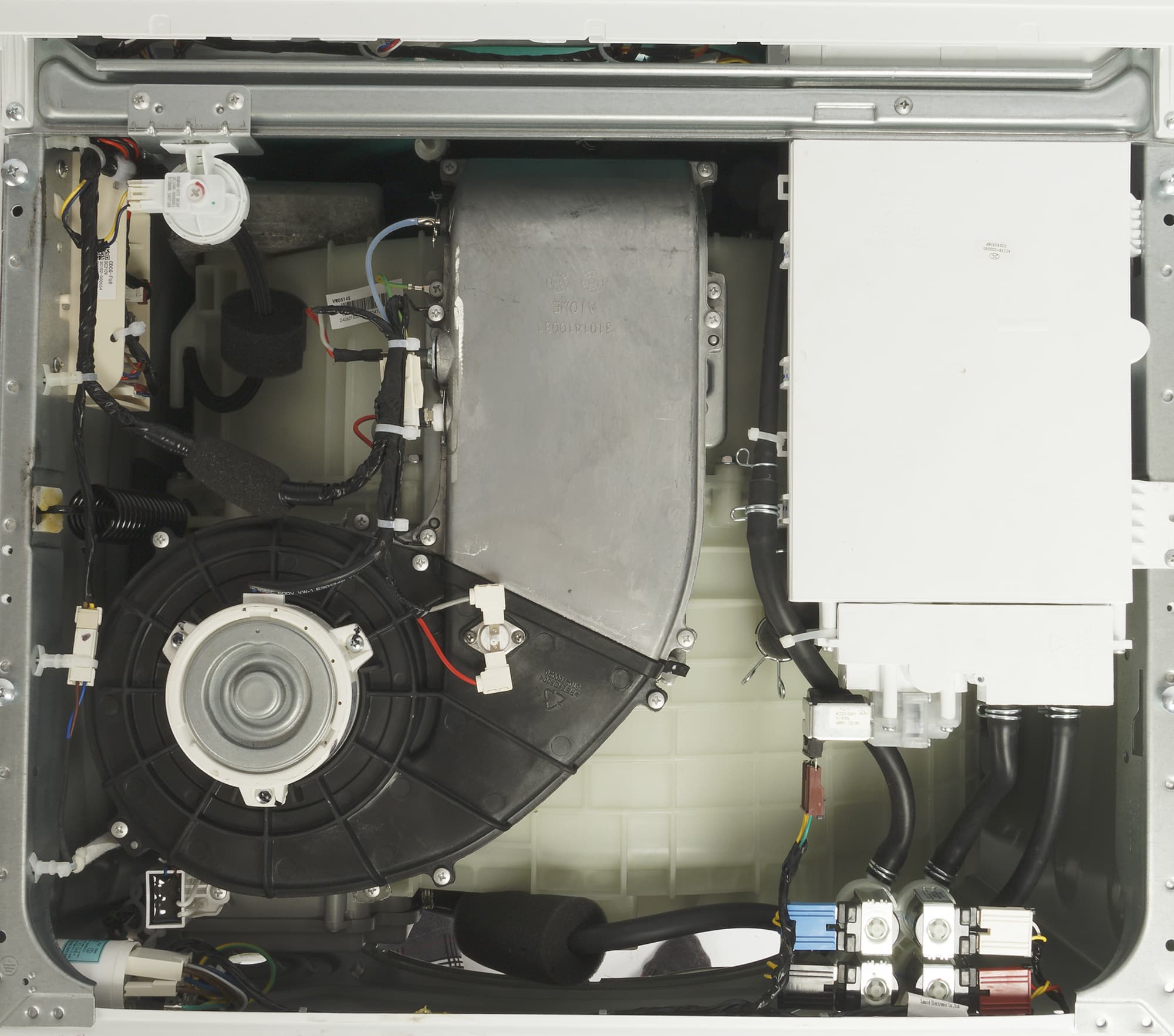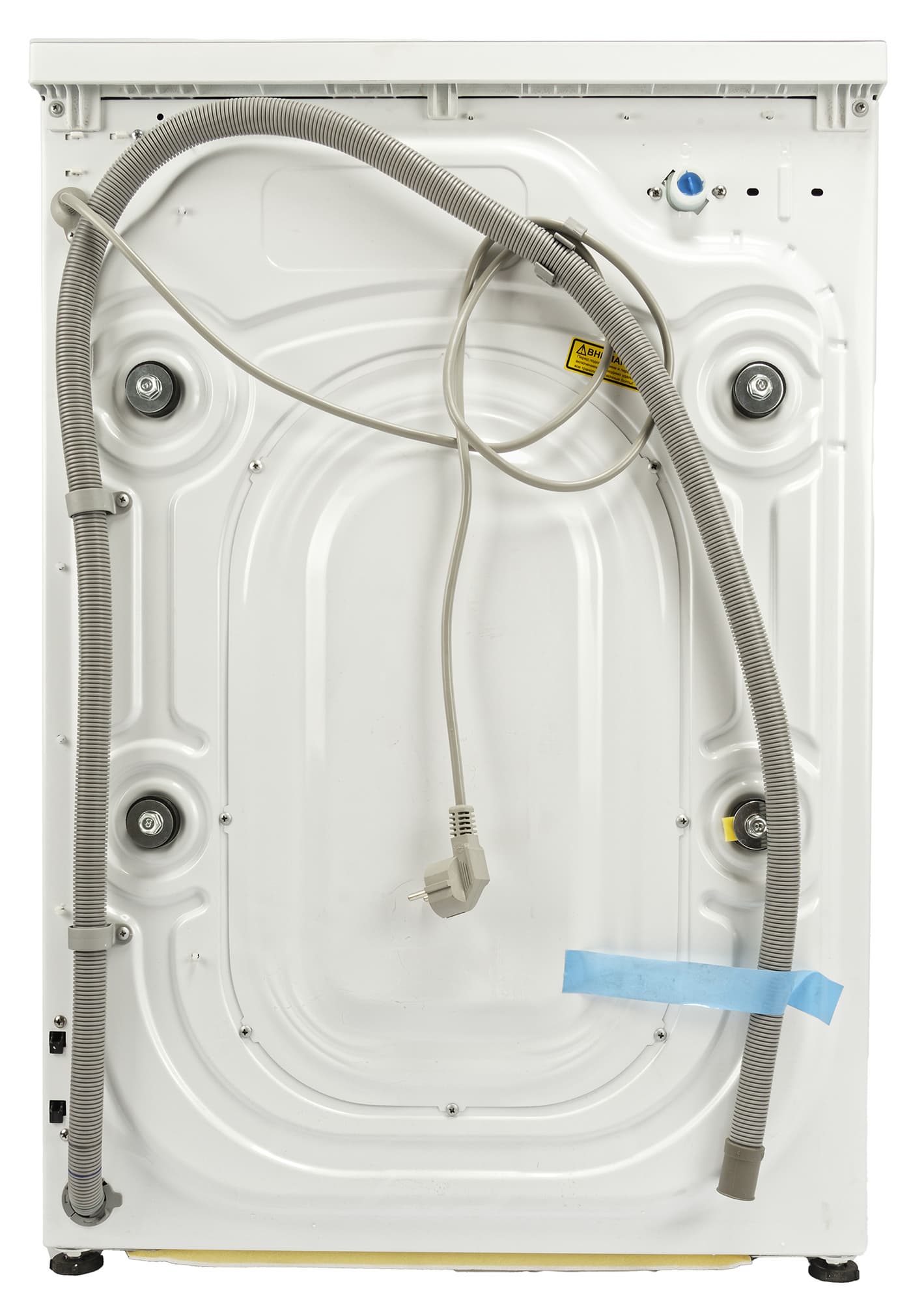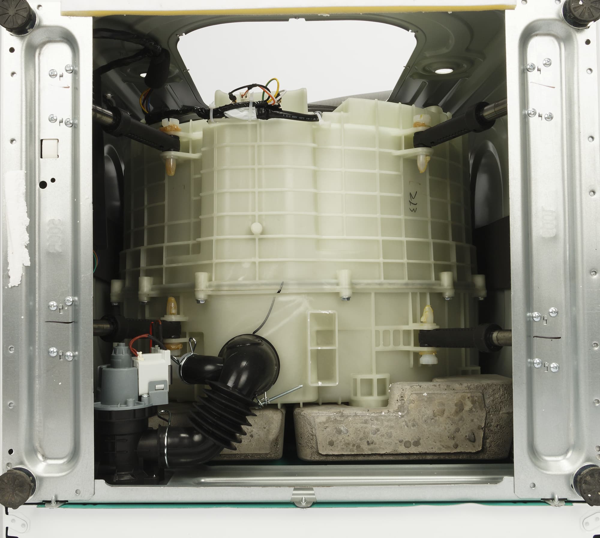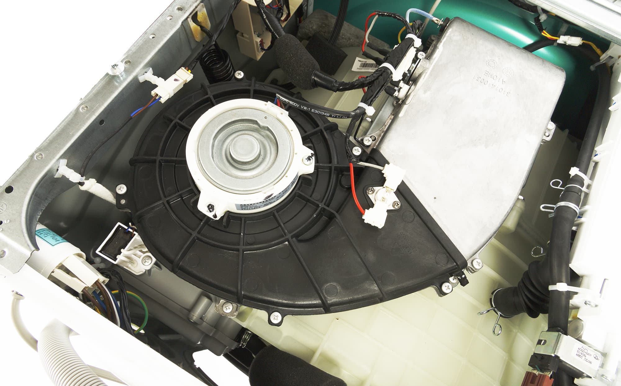 Сняв крышку на задней панели, мы убедились, что наша модель оборудована прямым приводом: такая конструкция повышает эффективность, увеличивает ресурс изделия и снижает шум при стирке, сушке и отжиме.