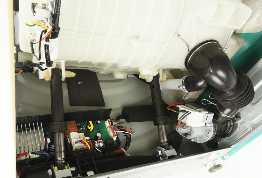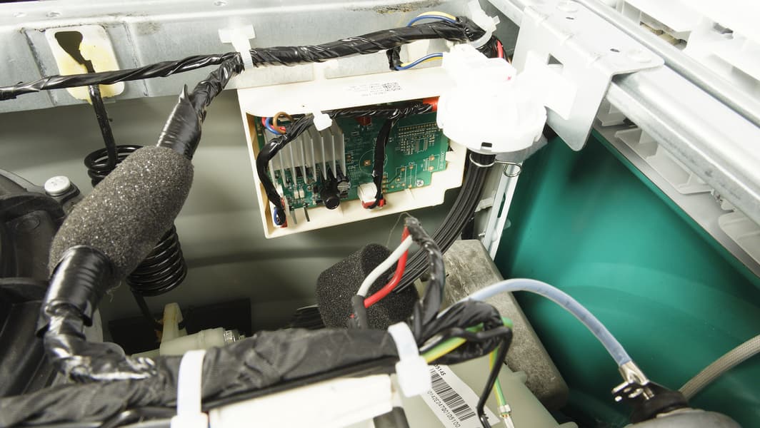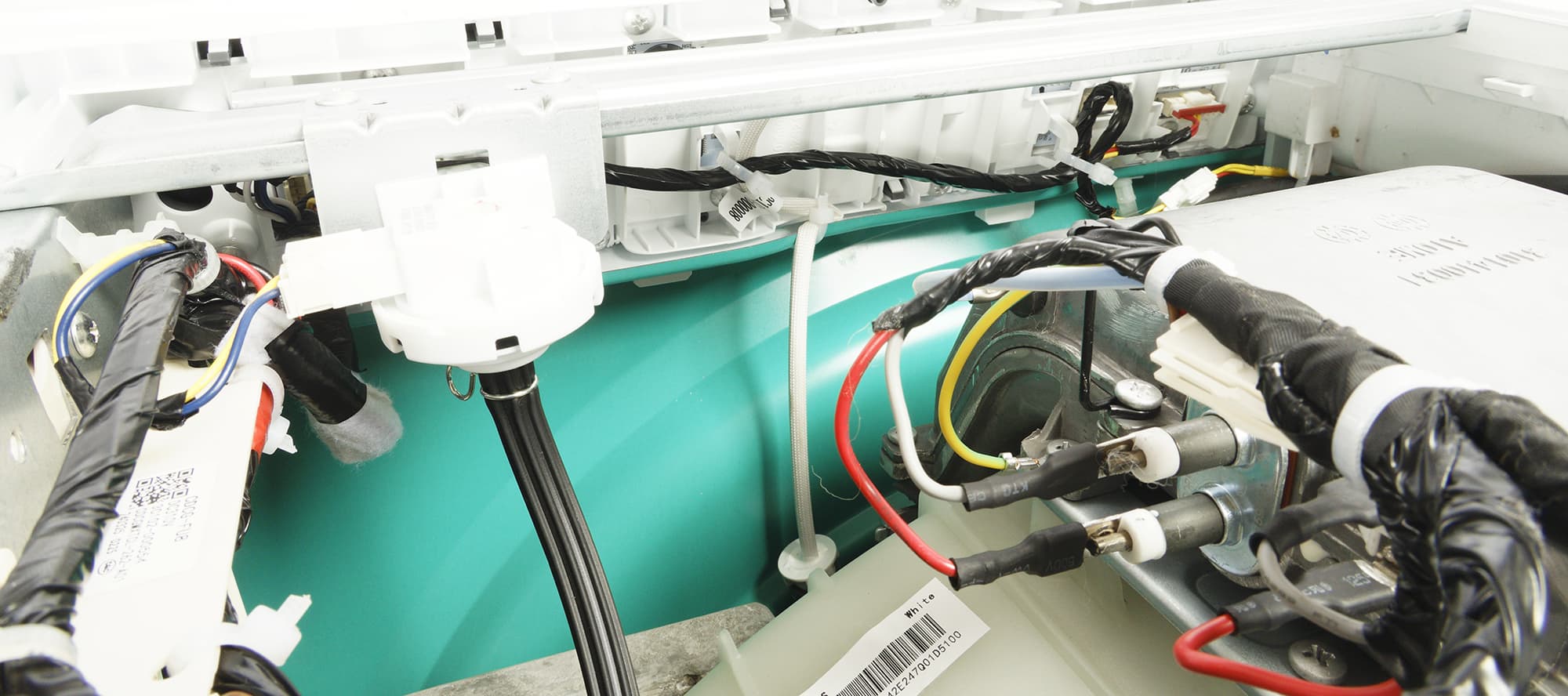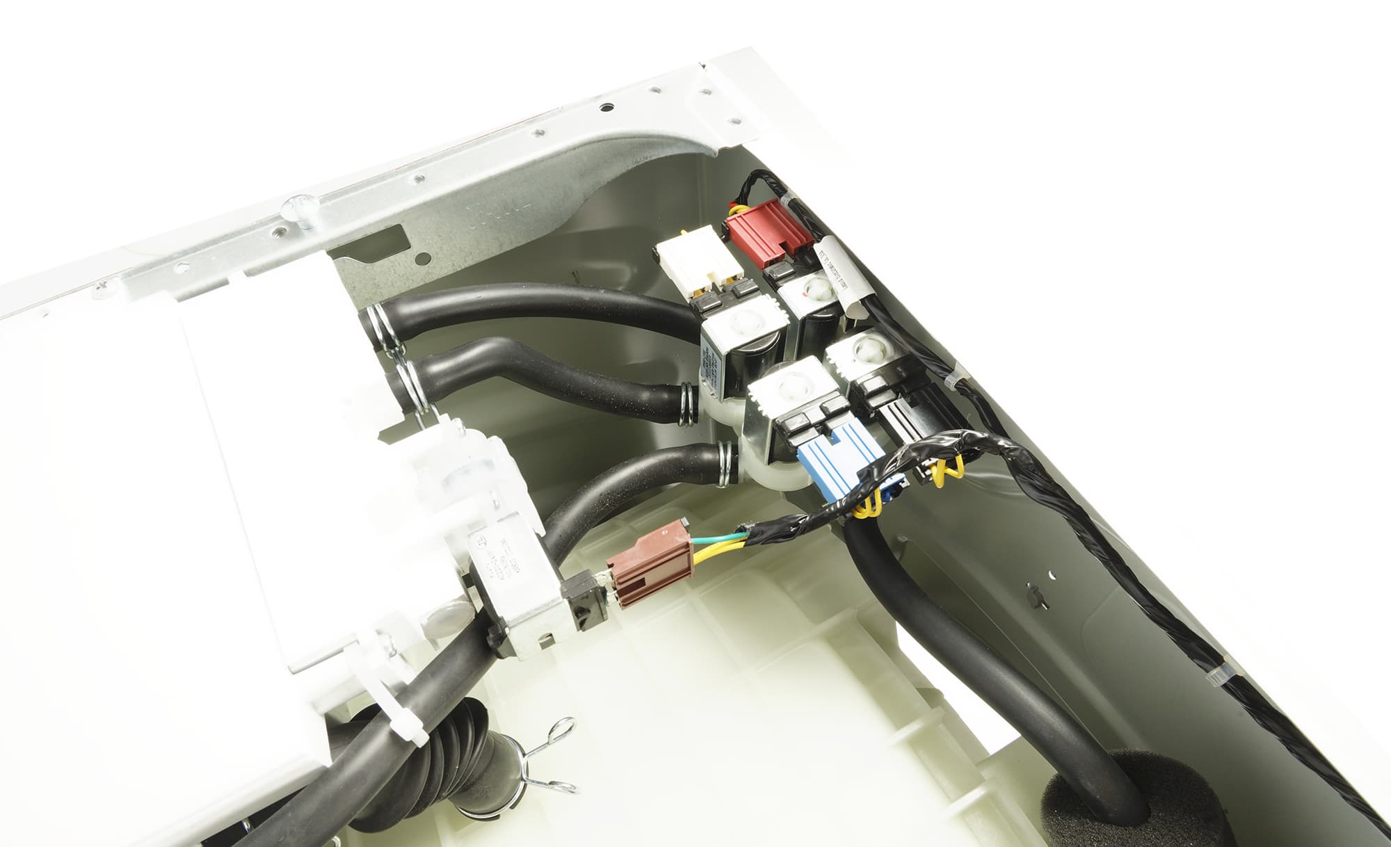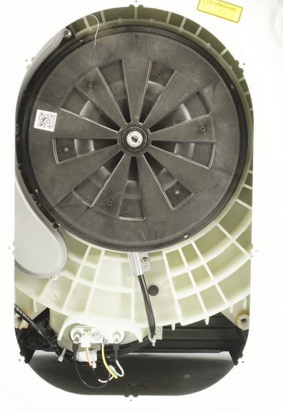 Сняв крышку на задней панели, мы убедились, что наша модель оборудована прямым приводом: такая конструкция повышает эффективность, увеличивает ресурс изделия и снижает шум при стирке, сушке и отжиме.