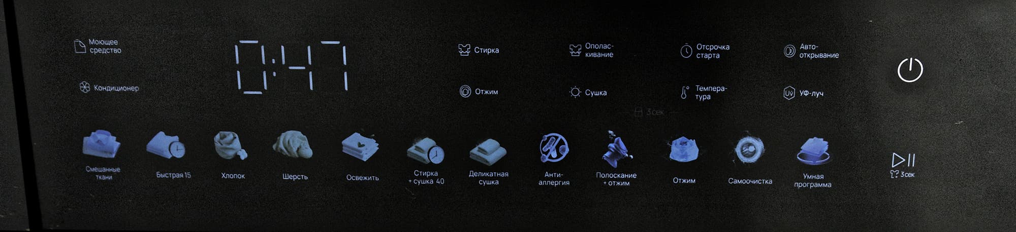 Панель управления стиральной машиной выглядит стильно и современно, но разборчивость мелких надписей и читаемость иконок оставляет желать лучшего: людям со слабым зрением при использовании устройством придется, пожалуй, напрягать глаза.