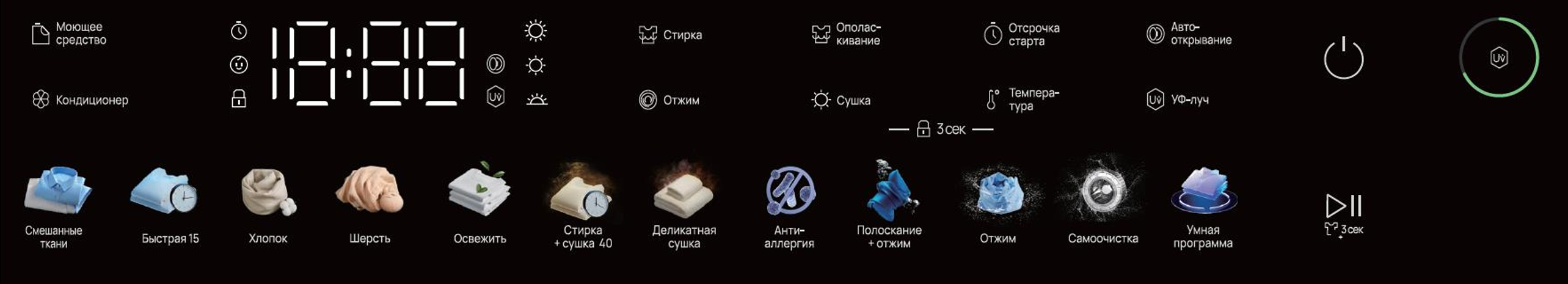 При активации опции УФ-облучения внутри барабана на этапе стирки и полоскания включается ультрафиолетовая лампа. Ультрафиолет, как сообщает производитель, препятствует размножению бактерий и предупреждает появление неприятного запаха.