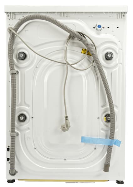 На задней стенке мы не наблюдаем ничего необычного: в верхнем правом углу размещен штуцер для подключения заливного шланга, сливной выходит из левого нижнего угла. В «походном» положении барабан фиксируется четырьмя транспортировочными винтами с резиновыми уплотнителями: их перед началом эксплуатации следует удалить, заменив прилагающимися заглушками из пластика.