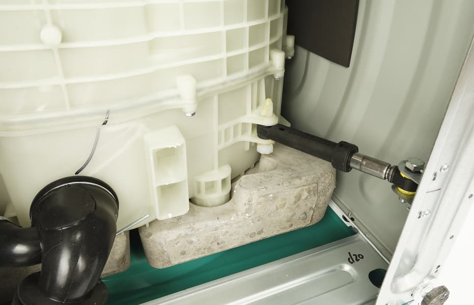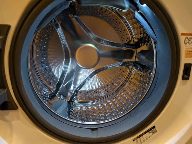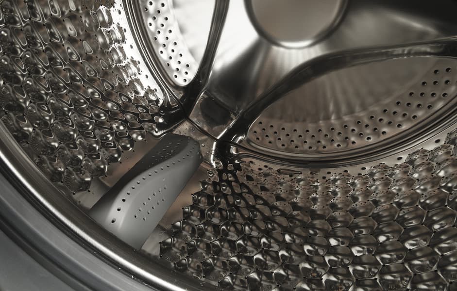 На внутреннюю поверхность барабана нанесены выпуклые шестиугольники, в углах которых — отверстия для циркуляции воды. Перфорация нанесена также и на торцевую часть емкости: через нее поступают пар и горячий воздух при сушке. Пластиковые бойники, перемешивающие белье, плавно изогнуты: это также способствует улучшению гидродинамики.