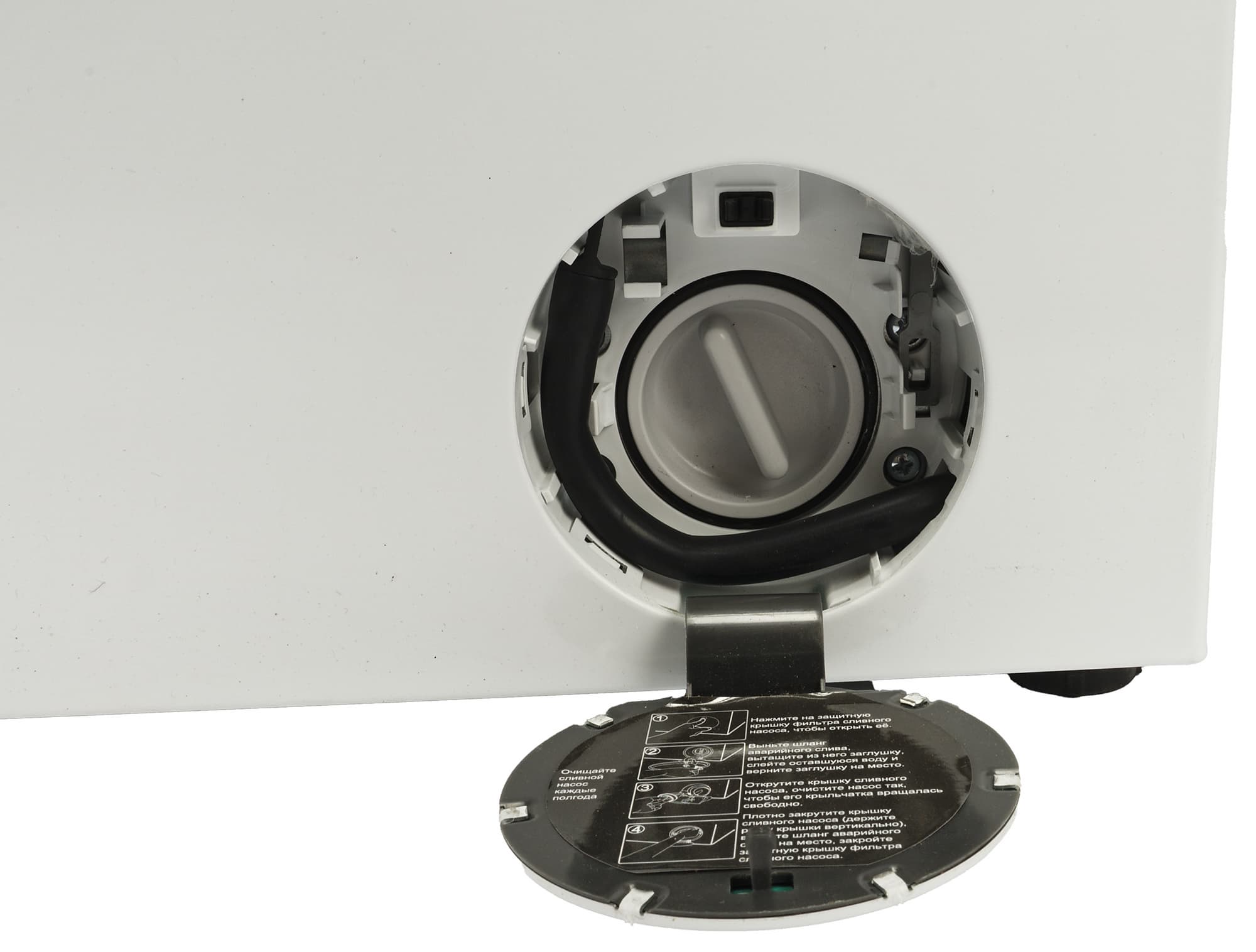 Под круглым лючком в нижнем правом углу передней панели скрываются выпускной фильтр и шланг аварийного слива воды. На обратной стороне крышки производитель разместил инструкцию по чистке конструкции.
