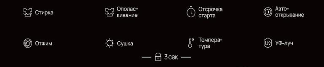 В левом верхнем углу размещены индикаторы заполнения резервуаров для моющих средств. Когда геля или кондиционера в емкостях достаточно, иконки горят ровным светом, а когда жидкость подходит к концу — мигают.