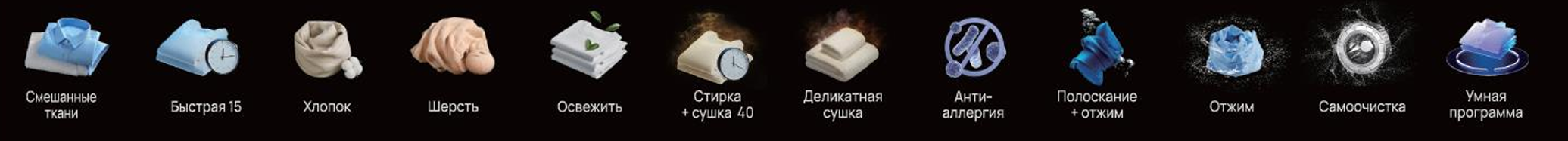 | Программы | Смешанные ткани, Быстрая 15 минут, Шерсть, Хлопок, Анти-аллергия, Стирка-сушка за 40 минут, Освежить, Сушка, Полоскание, Полоскание + отжим, Самоочистка, Отжим, Деликатная сушка, Умная программа |