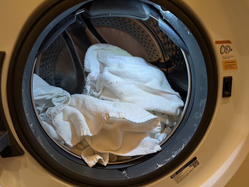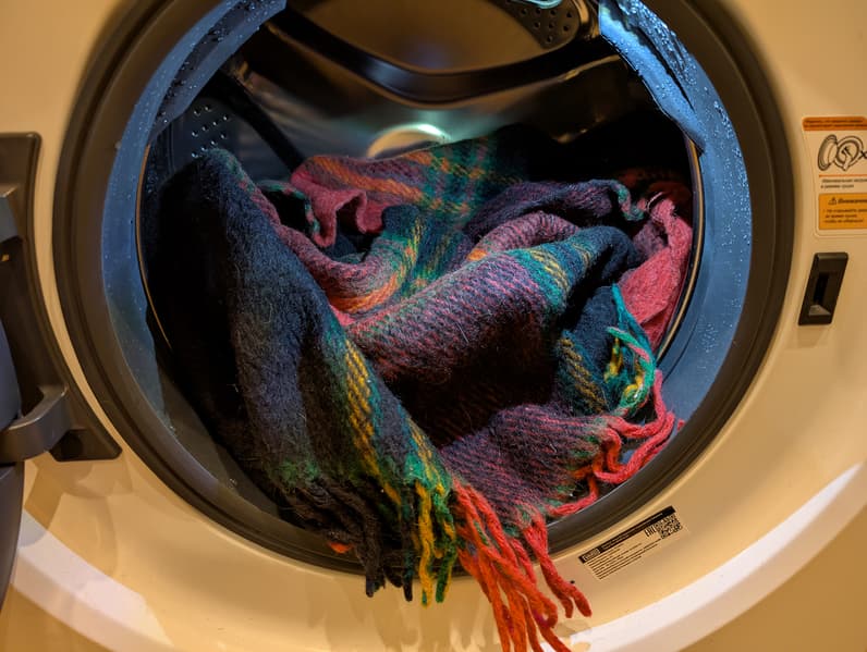 Конечно, нам приходится стирать не только хлопок, но и более деликатные ткани. Так что еще один наш постоянный тест — стирка шерстяного пледа весом чуть меньше килограмма.