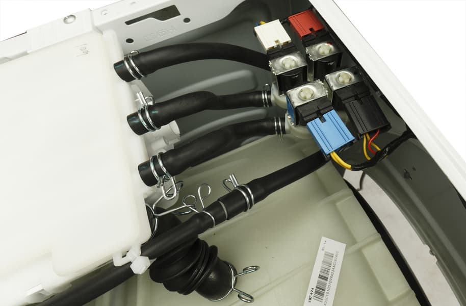Гофрированный сливной шланг уже установлен на стиральную машину. Заливной же привинчивается к водорозетке в верхнем правом углу задней панели. В транспортировочном положении барабан фиксируется четырьмя болтами с массивными резиновыми шайбами-амортизаторами: перед первым включением их следует удалить, заменив входящими в комплект пластиковыми заглушками.